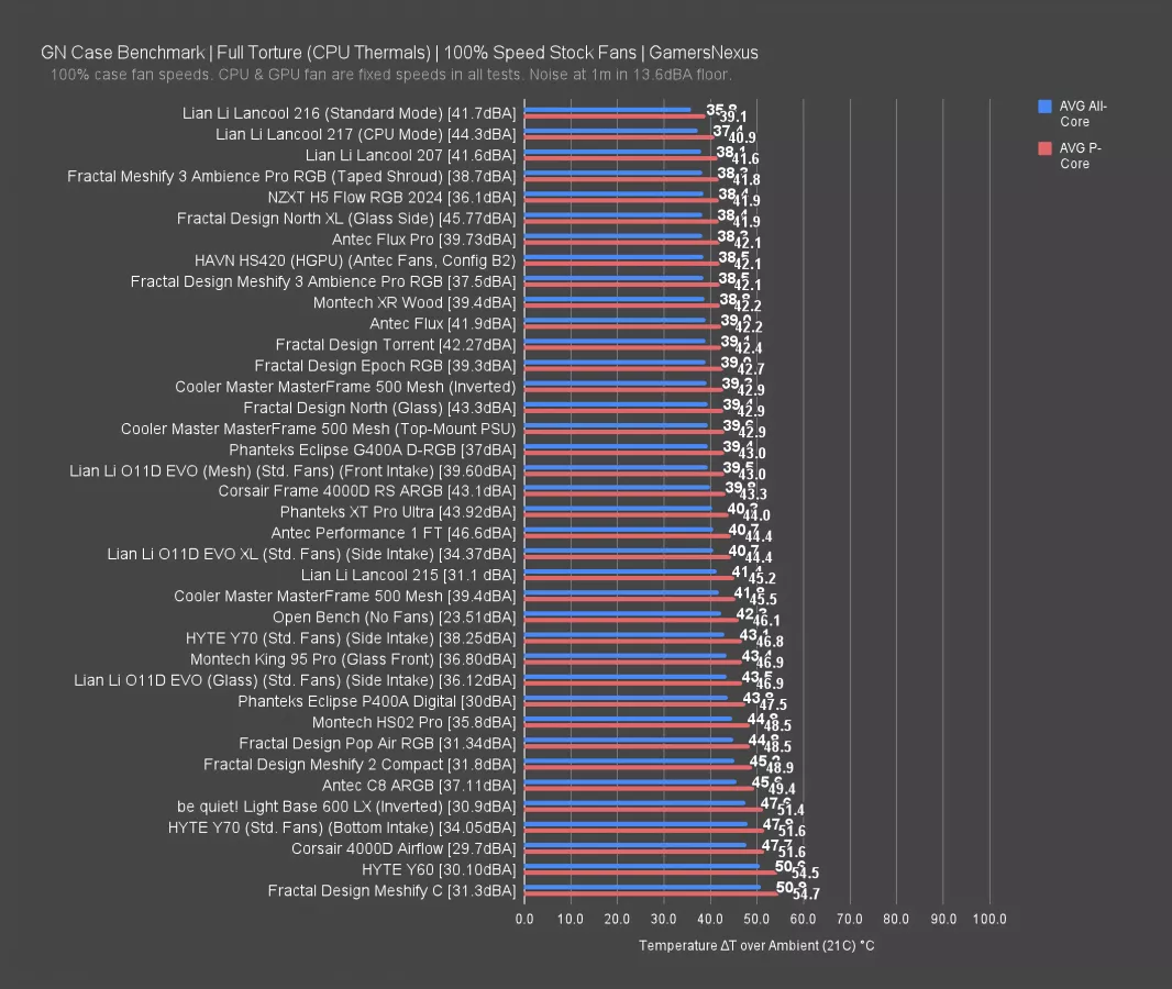 With all case fans at full speed, the all core CPU average dropped to 42 degrees above ambient and the P-Core average dropped to 46. Moving the PSU to the top of the case dropped both averages by about two degrees, which is actually a noteworthy improvement and beyond just error. This change would also affect flow-through behavior, which we’ll look at in the GPU chart.