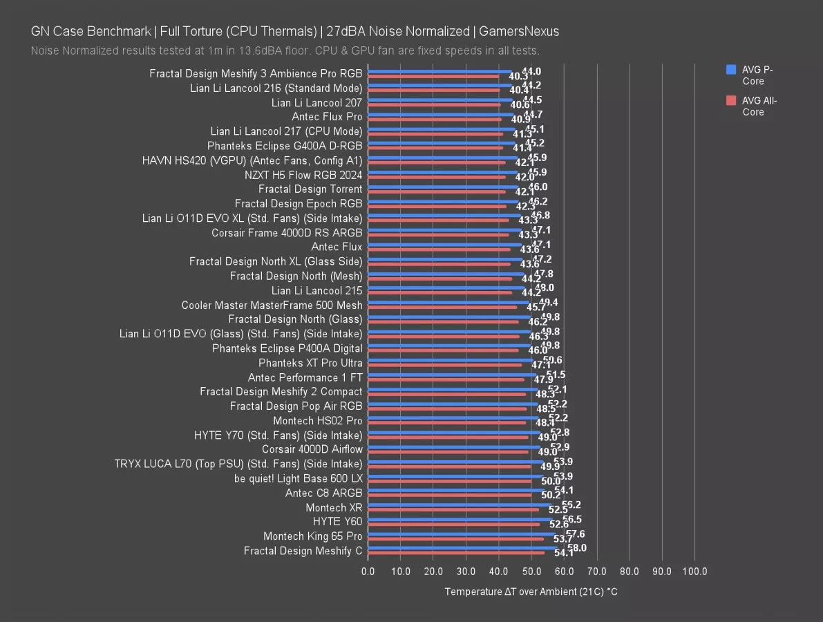 The GPU thermal results are weaker in comparison to the rest of the chart than the CPU thermals were, with the Frame 4000D RS at 42 degrees for average GPU temperature, the Meshify 3 at 41, the Torrent at 39, and the Flux Pro at 38.