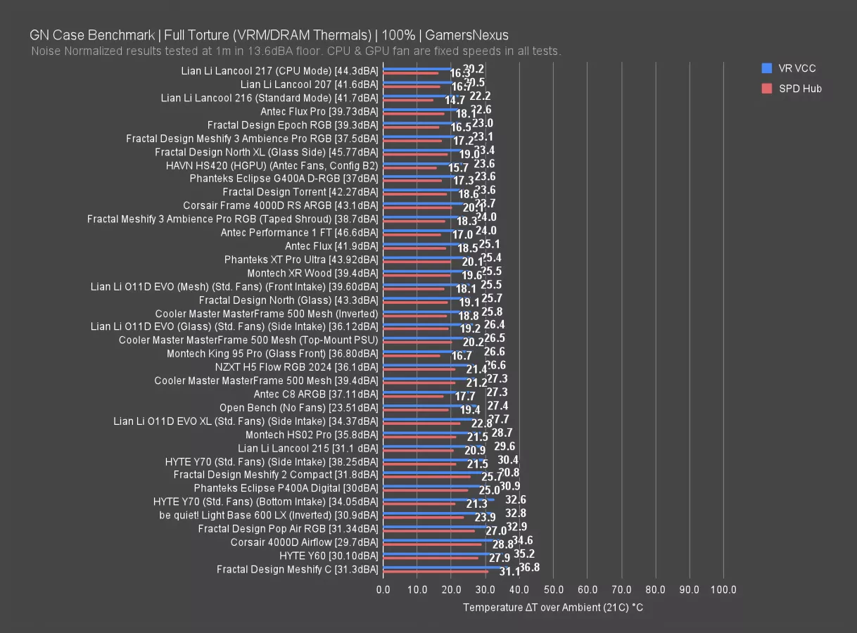 Moving to GPU thermals in the same test, the average GPU temperature in the MF 500 was 48 degrees Celsius above ambient and 53 degrees on the VRAM. That's behind the competition again, with the Frame 4000D RS averaging 45 degrees above ambient, the Meshify 3 averaging 43, the Flux Pro 41, and the Torrent 40. The MF500 is also beaten by the normal, cheaper Antec Flux.