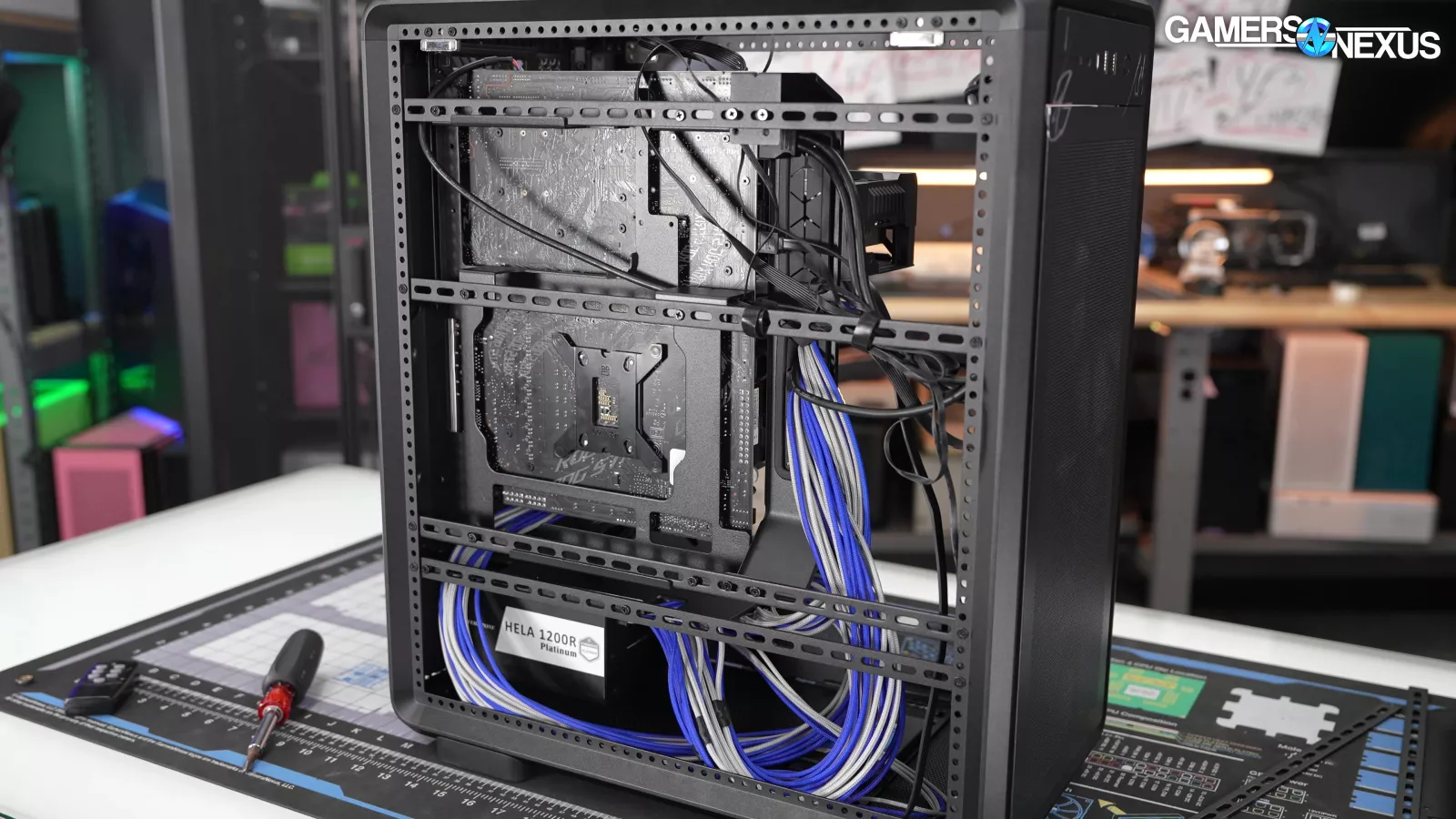 Thermal testing was done with a mix of configurations. First was a standard layout with the stock configuration, followed by a stock configuration with the motherboard shifted down and the power supply mounted up top, and finally followed by the inverted configuration.