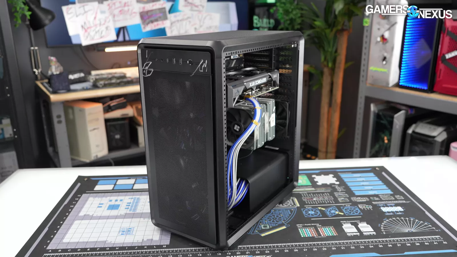 In all configurations, we kept the PSU fan oriented to pull air from the exterior of the case (facing away from the PSU shroud). The GPU support was not installed for any thermal tests.