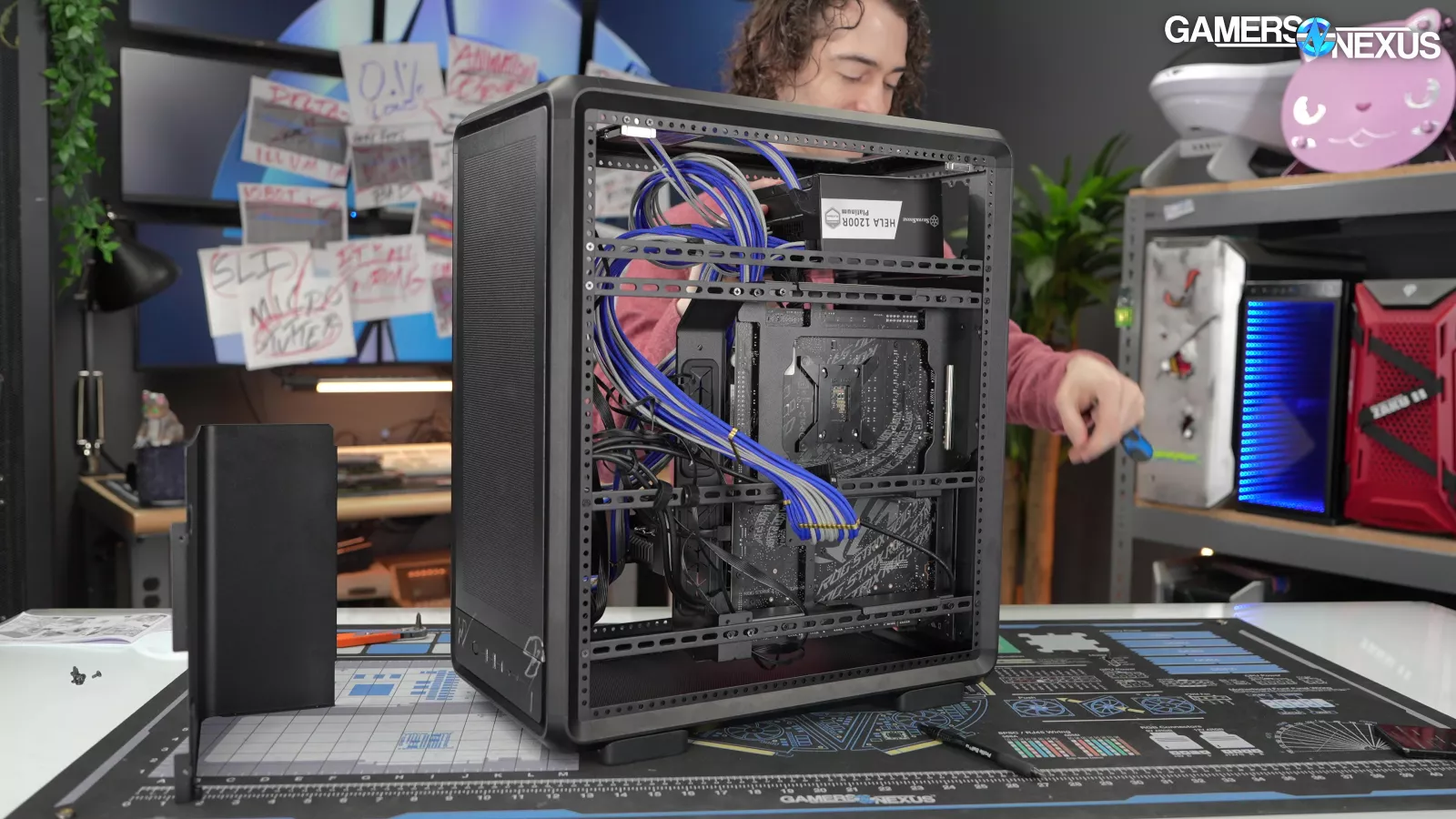 We'll start with noise normalized testing, where we step down case fan speeds inside our hemi-anechoic chamber until we hit our 27 dBA SPL target, measured one meter from the front of the case. We published a video showing our process to build this chamber previously and have gotten regular use out of it since it was built. This allows us to control our acoustic environment so that outside noise doesn’t affect our results. Test hardware like this is made possible through your support on store.gamersnexus.net.