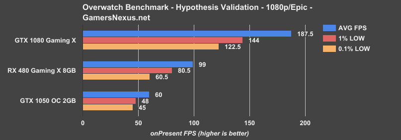 In order to kill two birds with one stone, we used our standard case testing system installed in the Fractal Define C (reviewed). Normally, this system has an MSI GTX 1080 Gaming X installed in it, and we used this to establish a baseline “best possible” scenario. After a couple of matches against real players at all epic settings on Oasis, the ingame framerate averaged out at 187.5 FPS (just a coincidence, not the GTA V Curse). The other two cards chosen were an MSI GTX 1050 ($115) and an MSI RX 480 Gaming X. This gives us fairly wide coverage of the GPU stack, without multiplying workload by insane amounts. Here’s a preview of how they fared, establishing our launching point for content: