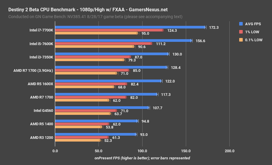 Starting comparative benchmarks with 1080p and Highest settings, the Intel i7-7700K chart-tops at 171FPS AVG, which is bumping against the 200FPS frame cap that’s enabled by default. This means that frametime latencies faster than 5ms will be capped to 5ms, and so will drag down the average below what could be possible. The next CPU in line is the i5-7600K stock CPU, performing at 157FPS AVG, 104 FPS 1% lows, and 87FPS 0.1% lows. This is trailed next by the i3-7350K at 131FPS AVG, with lows at 88 1% and 79FPS 0.1%. Our overclocked R7 1700 – effectively a stand-in for the 1700X and 1800X as well, since they all can achieve similar clocks – performs at 126FPS AVG at 3.9GHz. This plants the 3.9GHz R7 CPU a few FPS behind the i3 CPU. Part of this performance deficit is due to Destiny 2’s failure to acknowledge all the threads, as only the physical cores are engaging properly. We know that this isn’t the performance people want to see out of an R7, but remember that Destiny 2 is having trouble with SMT and other issues in its beta. Our confidence isn’t strong enough right now to state with authority that these results are representative of all configurations and scenarios, as the game is still developing and clearly has some issues.
