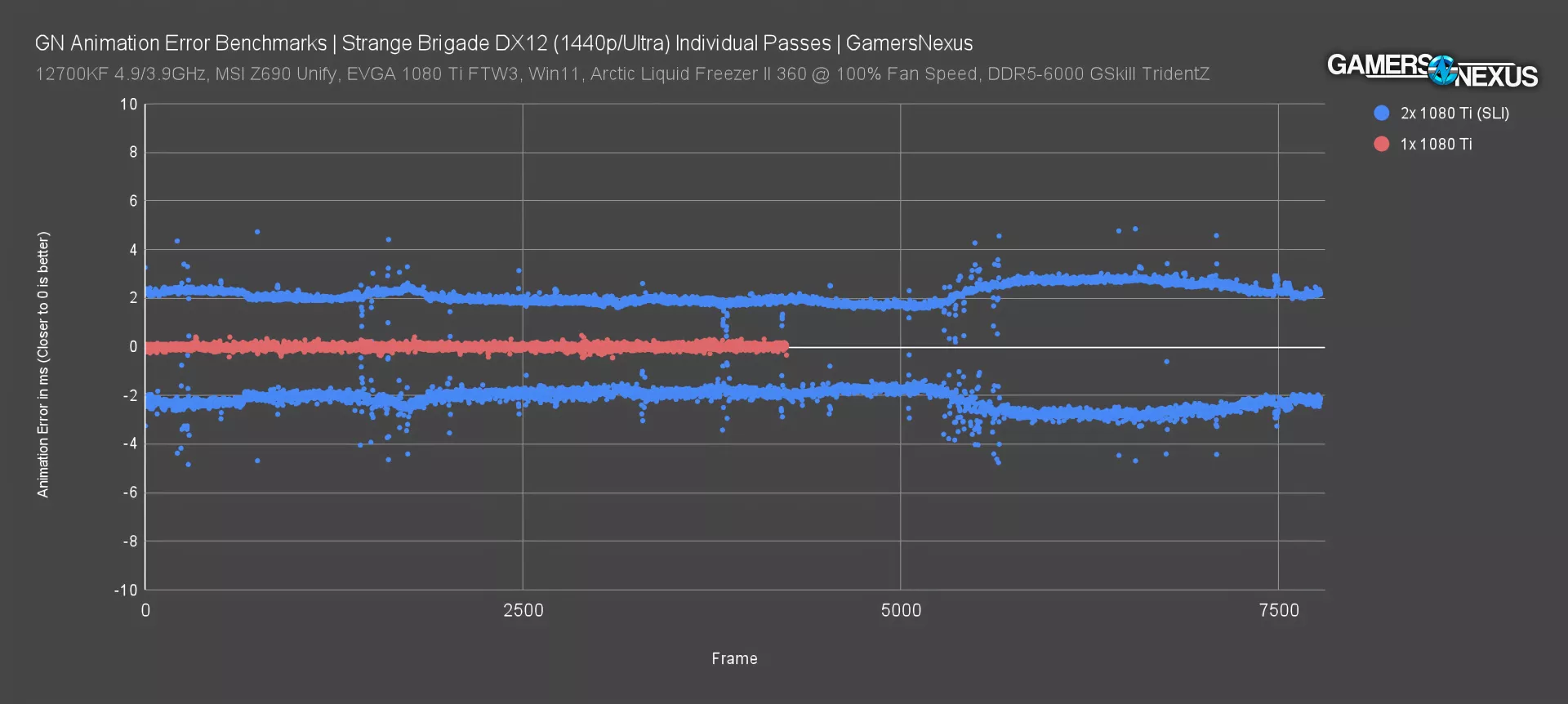 By plotting the animation error, we can get rid of frametimes as a variable and just compare that relative spikeyness as a player would truly feel it interacting with the game itself. This is closer to the real experience, in the same way end-to-end latency can be but for different reasons. The further the deviation from zero in either direction, the worse. The cards in SLI frequently had 2-3ms of animation error per frame, while the single card typically had well under 1ms animation error. The SLI configuration is significantly worse for animation error in a relative sense, despite even the frametime data looking not that dramatic.