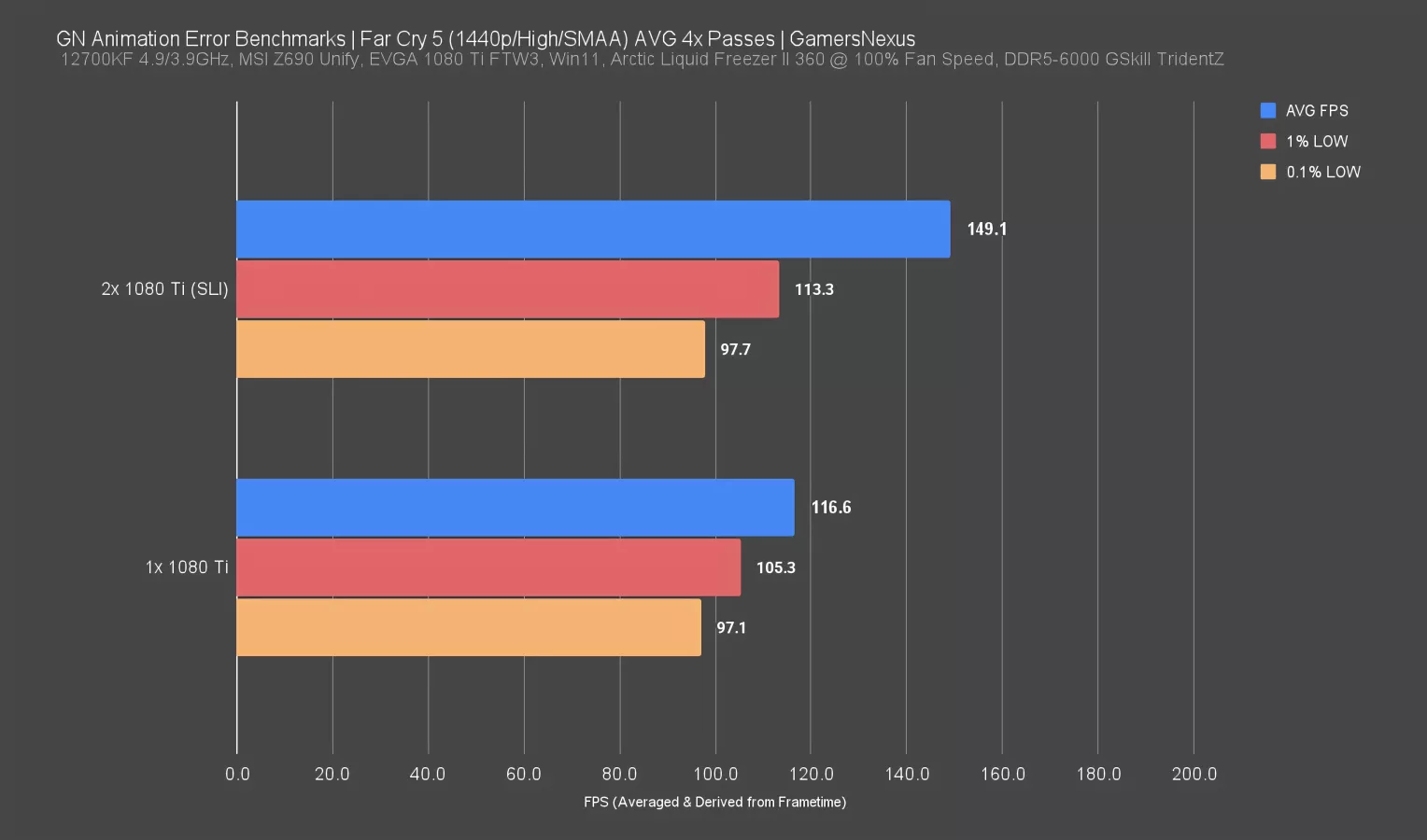 These are averaged results for 30 second logs of Far Cry 5's baked-in benchmark, one using a single 1080 Ti and one using two 1080 Tis in SLI. The 1% and 0.1% lows indicate that there weren't huge frametime spikes, and it’s these metrics that tell us when we should inspect a frametime plot closer for major problems. Average FPS smooths over problems, 1% and 0.1% are still averages and can still smooth over them, but are more likely to draw our attention toward a problem because they’re averaging the worst 1% and worst .1% of data.