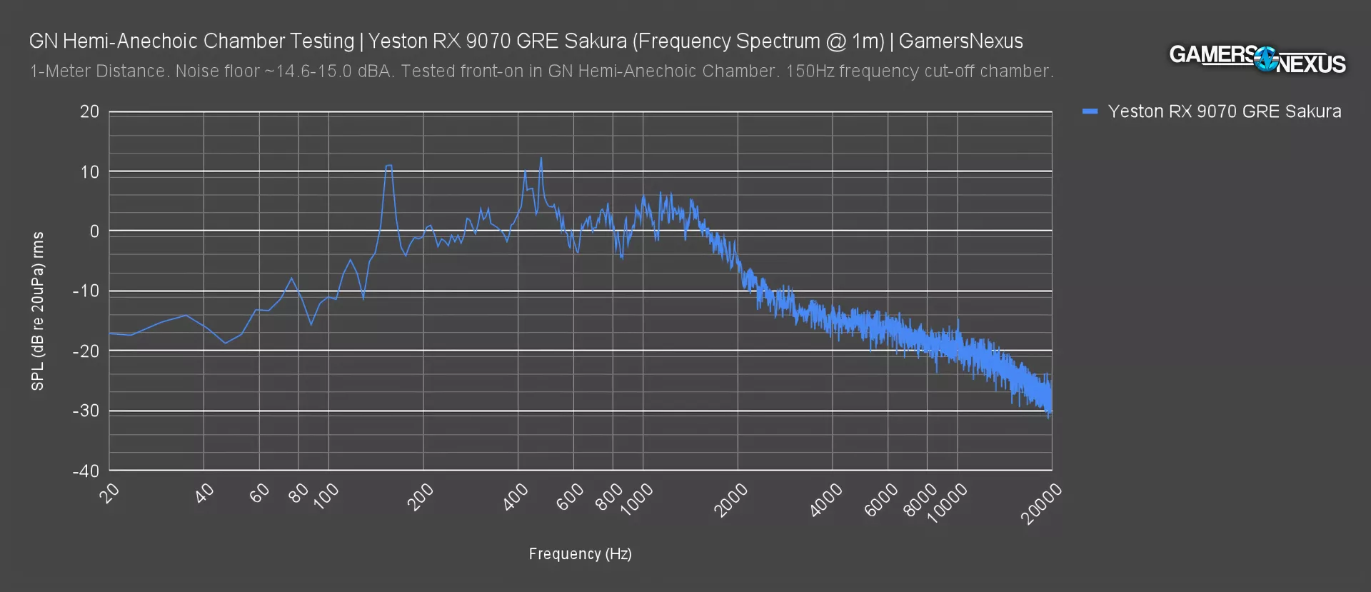 We also ran a quick acoustic test with the Yeston RX 9070 GRE Sakura in our hemi-anechoic chamber that we built for controlled noise testing. In this testing, we put the Waifu in our sound chamber and test it for the acoustic frequency and noise levels of the Waifu when under strenuous load.