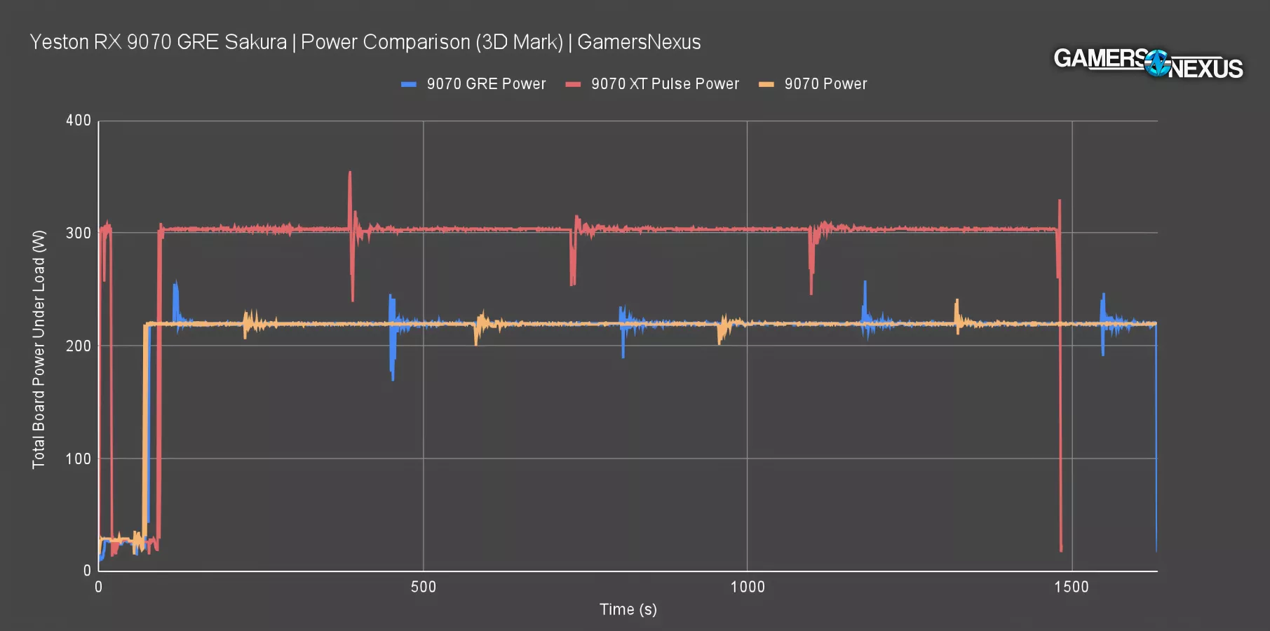 This testing is run with the 9070 GRE at the auto fan speed that it leveled-out at during the earlier thermal testing, so around 1030-1070 RPM.