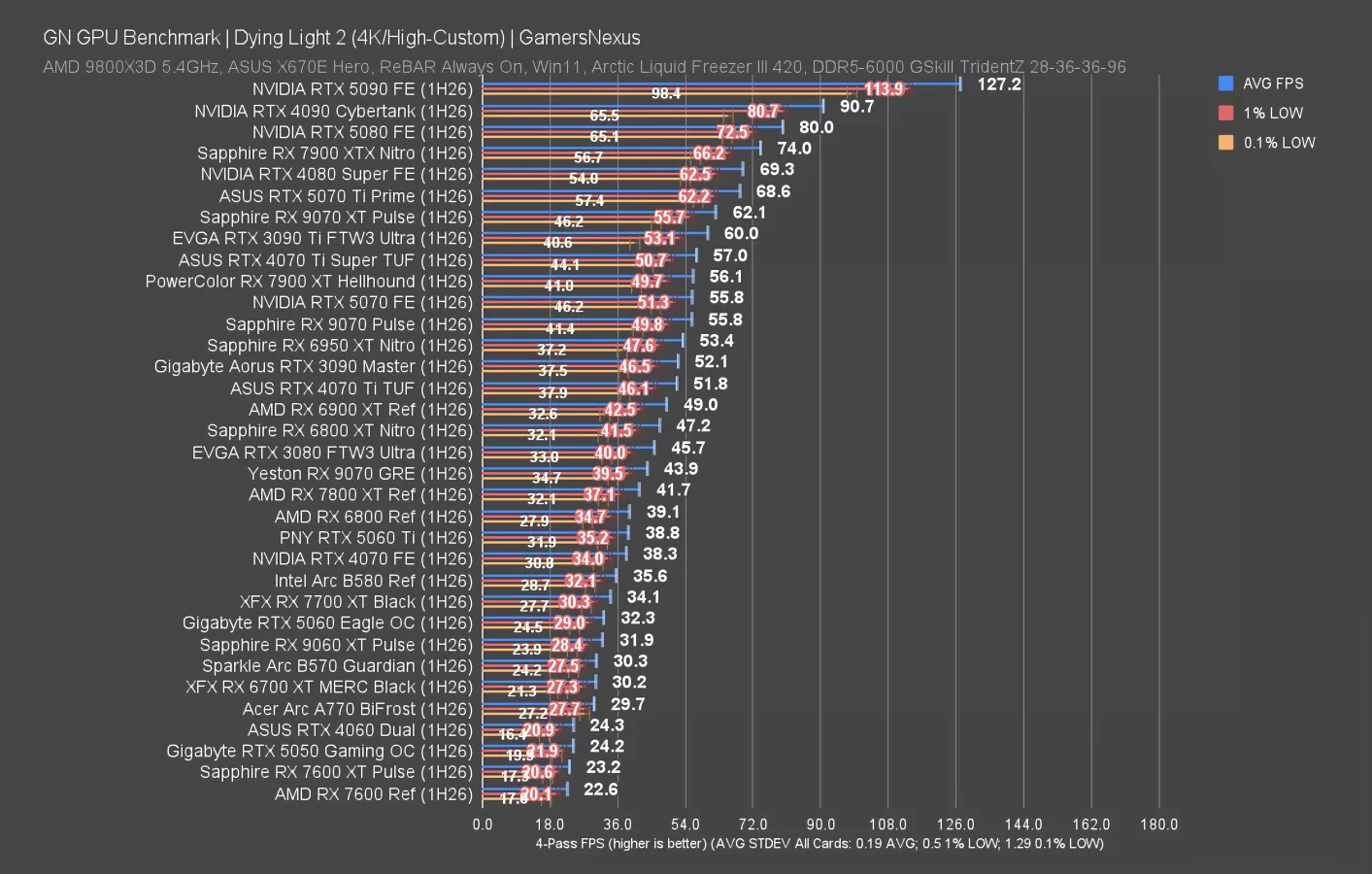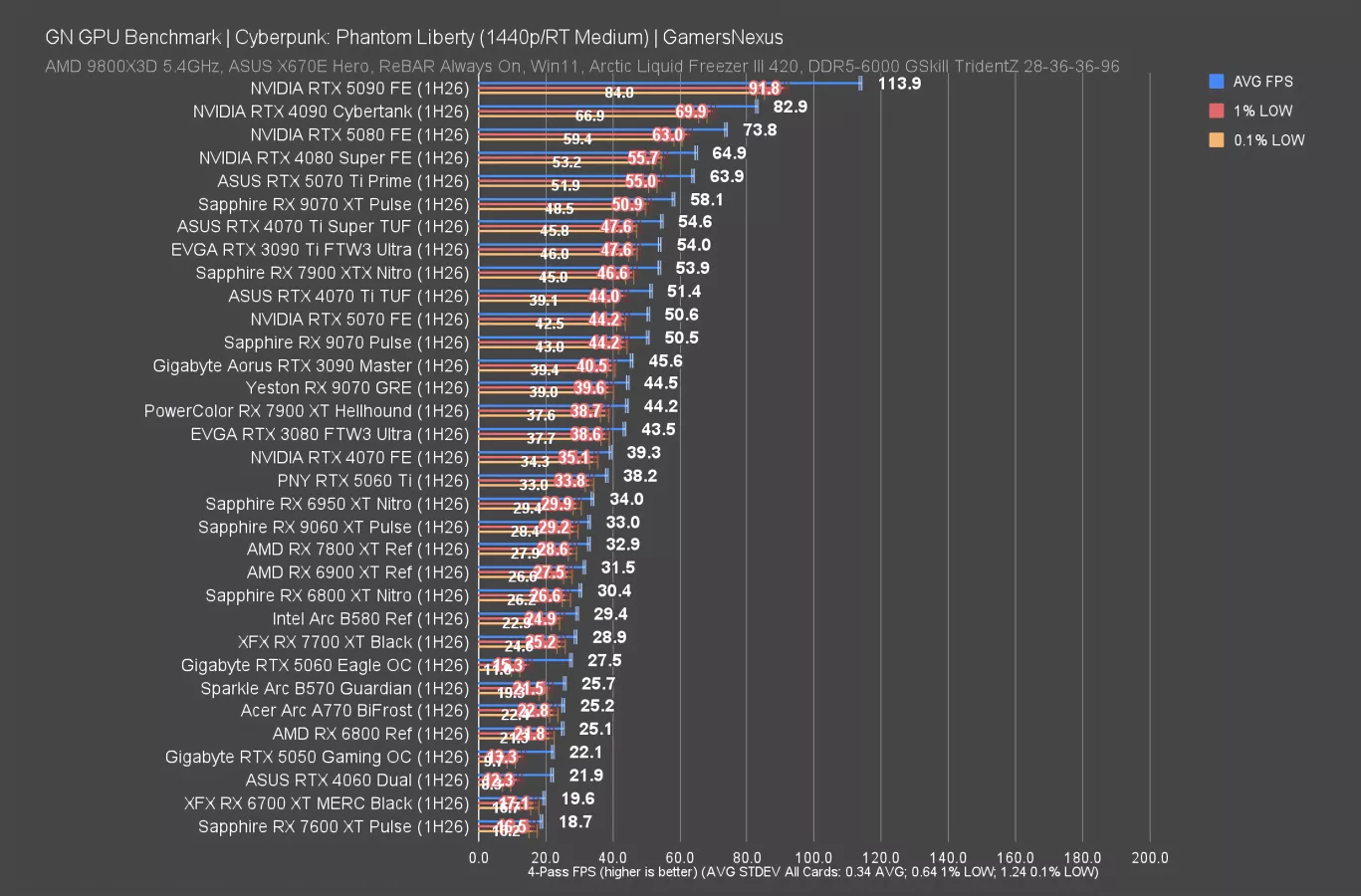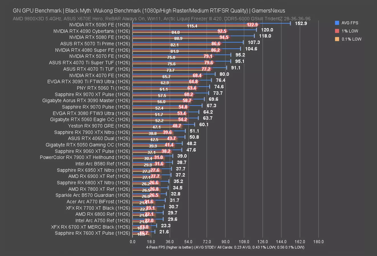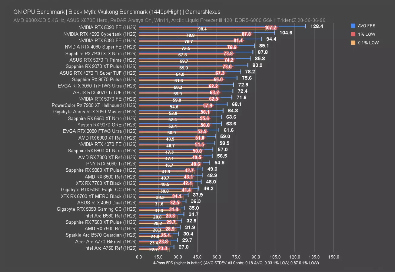 We’re seeing the same lineup, with the 9070 GRE, 9070, and 9070 XT each about 10 FPS away from the next card. The 9060 XT breaks that pattern with an 81 FPS AVG result, putting it just past 20 FPS below the 9070 GRE. NVIDIA’s competition positions the 5070 just below the 9070 XT, so this is either a good result for NVIDIA or a bad result for AMD, depending how you look at it, and the 5060 Ti sits measurably below the 9070 GRE.