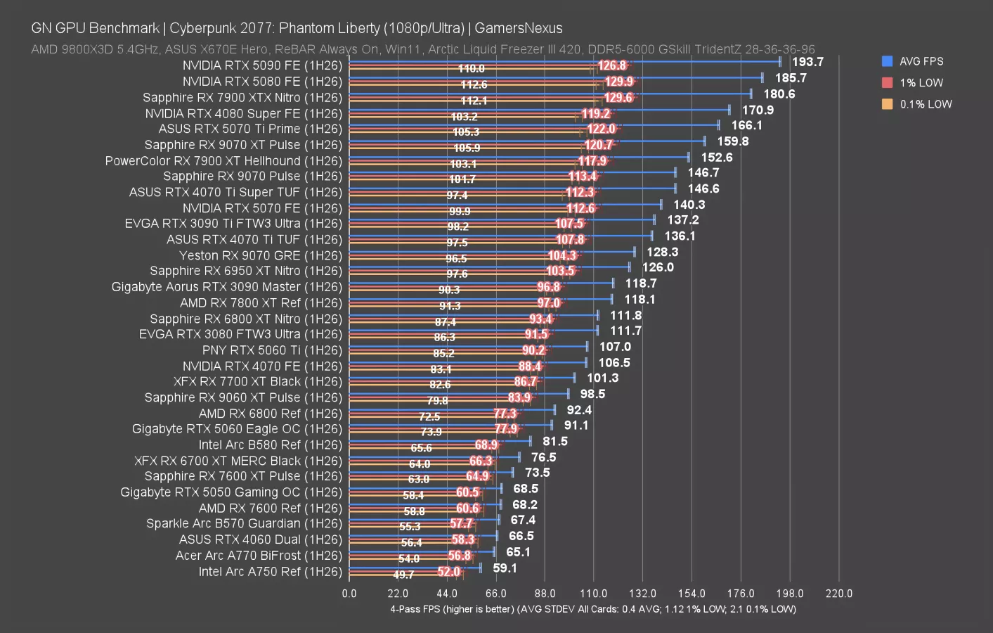 At 1080p, the 9070 GRE is in a playable position at 71 FPS AVG, just behind the 3090 and ahead of the 7900 XT. These are all about the same, including in lows. The 5070 leads the grouping, including a technical but irrelevant victory over the 9070 Pulse. The 5060 Ti gives the GRE about a 14% advantage.