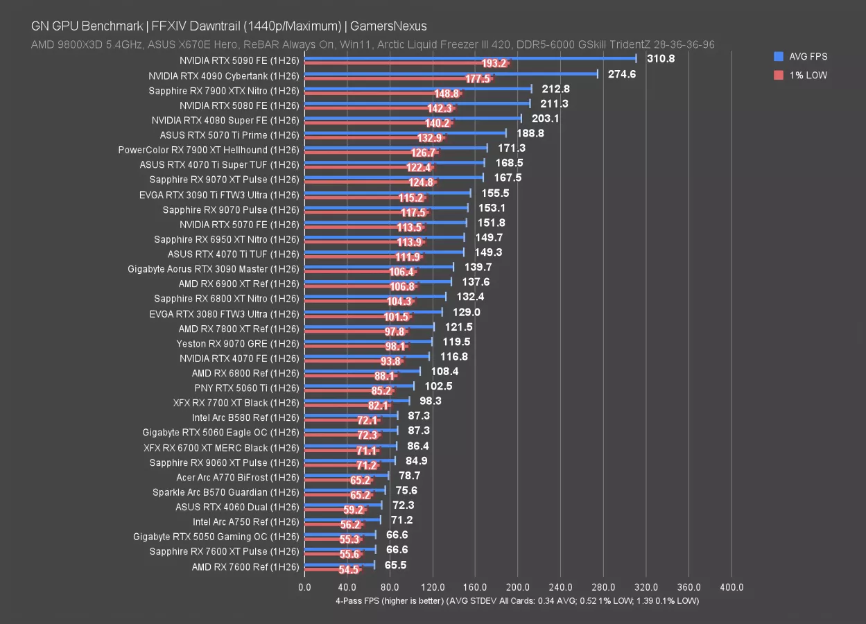 At 1440p, the 9070 GRE held a 79 FPS AVG, equaling the 3090 Ti in all 3 metrics. Obviously, the 3090 Ti’s real value these days is in its 24 GB of VRAM, but in terms of performance, these two are the same today. The 6950 XT is also about the same as the 9070 GRE, with the 5070 technically below it but experientially identical.