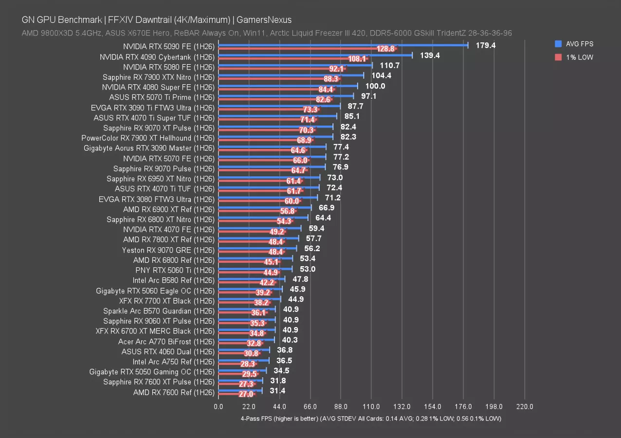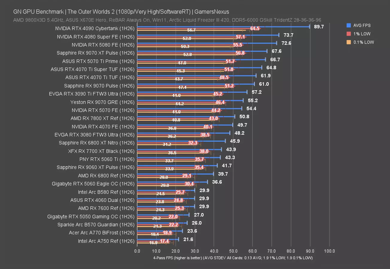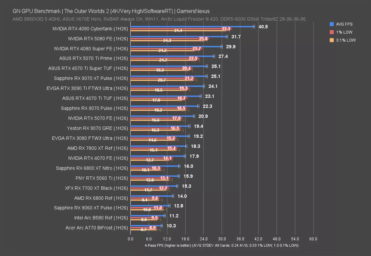 In Starfield at 4K, which is remarkably consistent (not that anyone would ever be playing it to notice), the 9070 GRE ran at 51 FPS AVG and had 1% and 0.1% lows consistent with neighbors. The 5070 ties the 9070 GRE, and actually, the 3090 Ti (watch our review) isn’t far ahead.