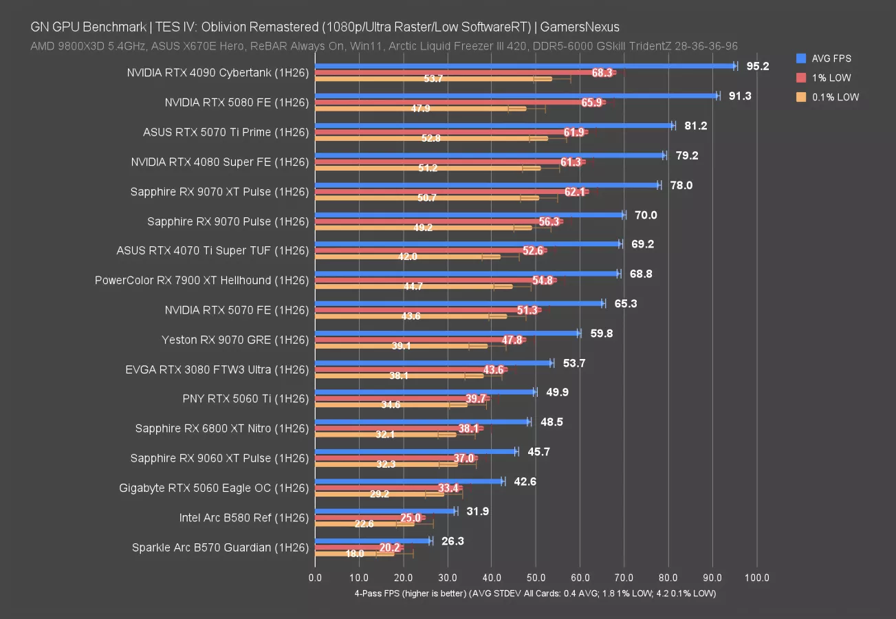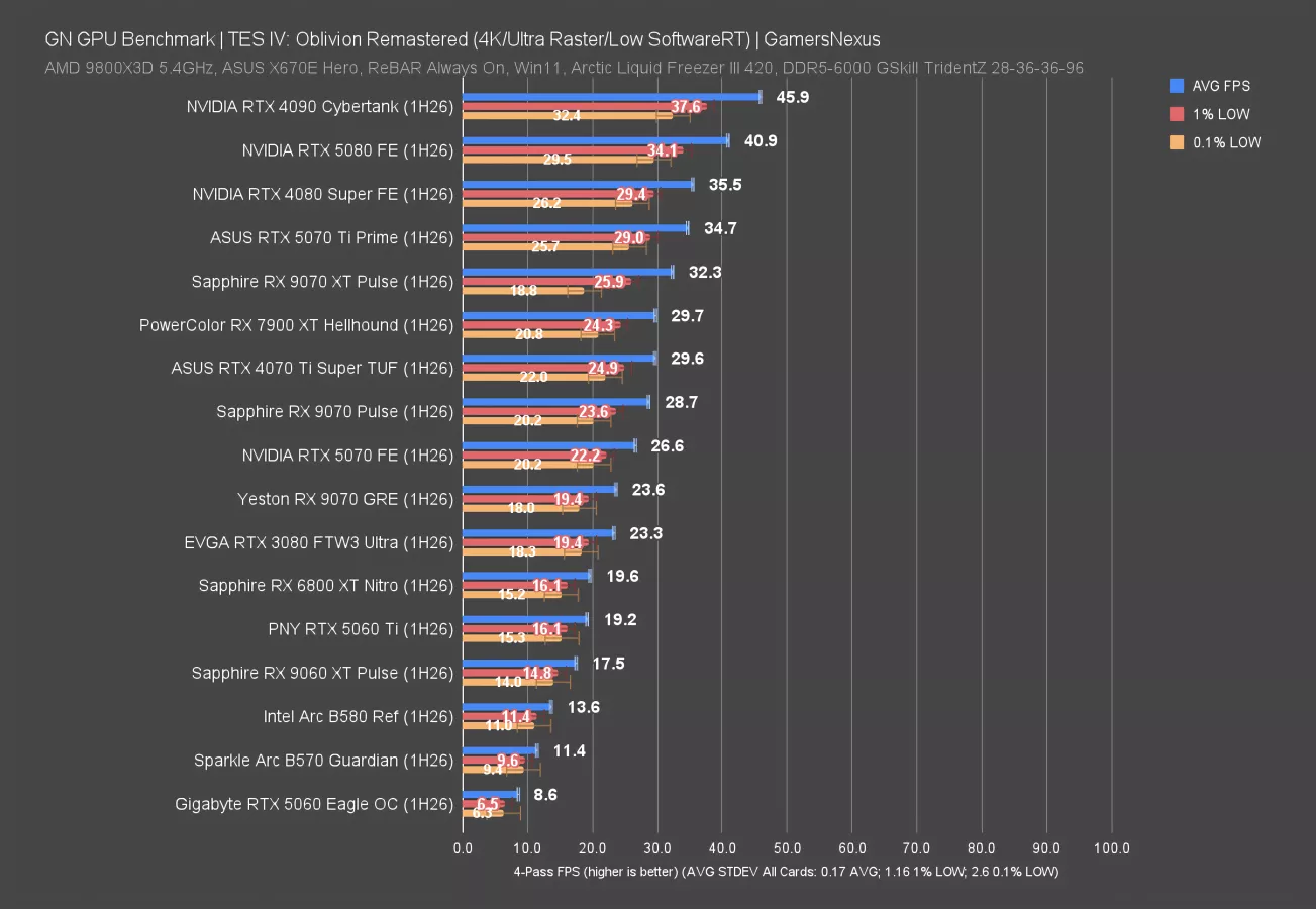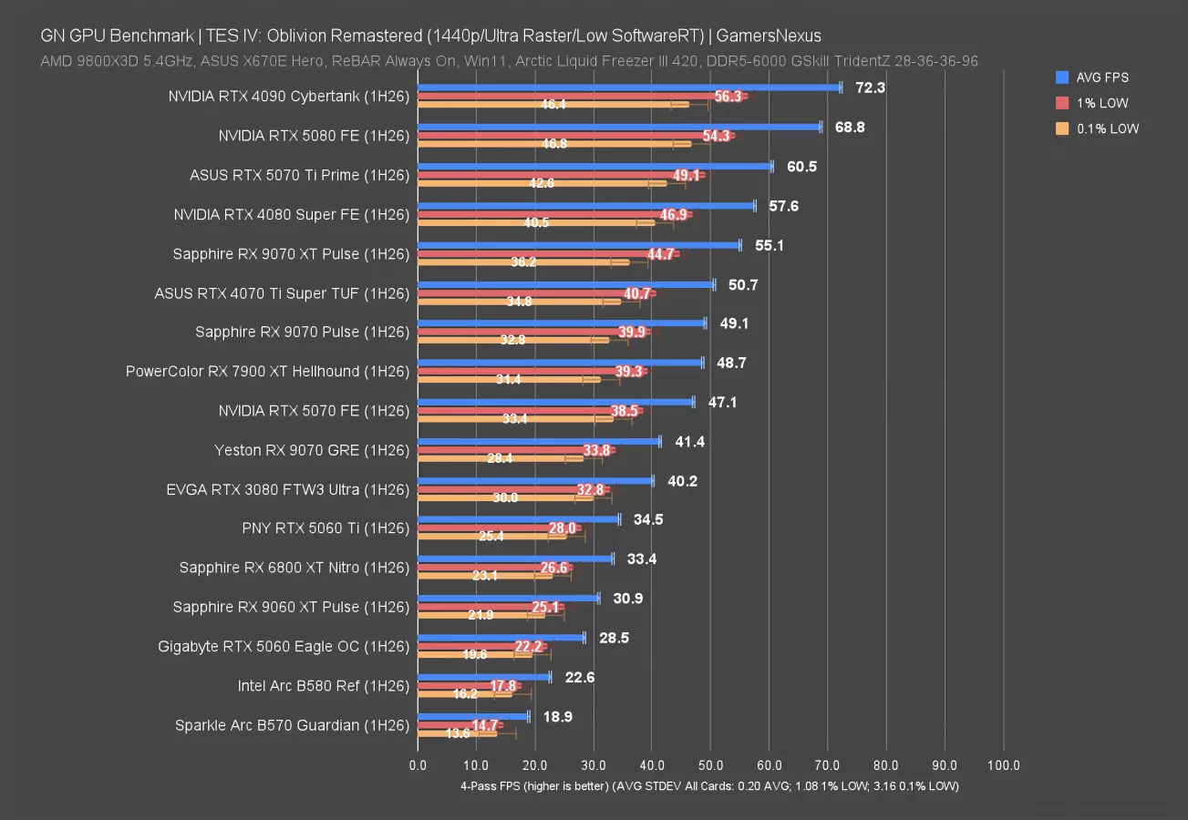 The next one takes us way back, but remastered: This benchmark is also new to our suite and uses The Elders Scrolls IV: Oblivion Remastered. This one’s also intensive. As a cautioning note, we’ve had trouble getting consistent testing with this game since the shader compilation requires a lot more care in monitoring, but we think we have it to a publishable level.