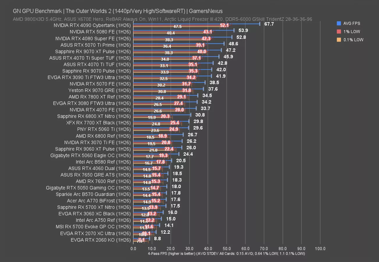 While we’re on games with a more limited data set, we’ll look at The Outer Worlds 2. This is another game we added from the 2025 lineup of releases, and it’s another that has proven overall consistent run-to-run. It’s also intensive with forced RT. We’re using software RT to maximize compatibility and comparability.