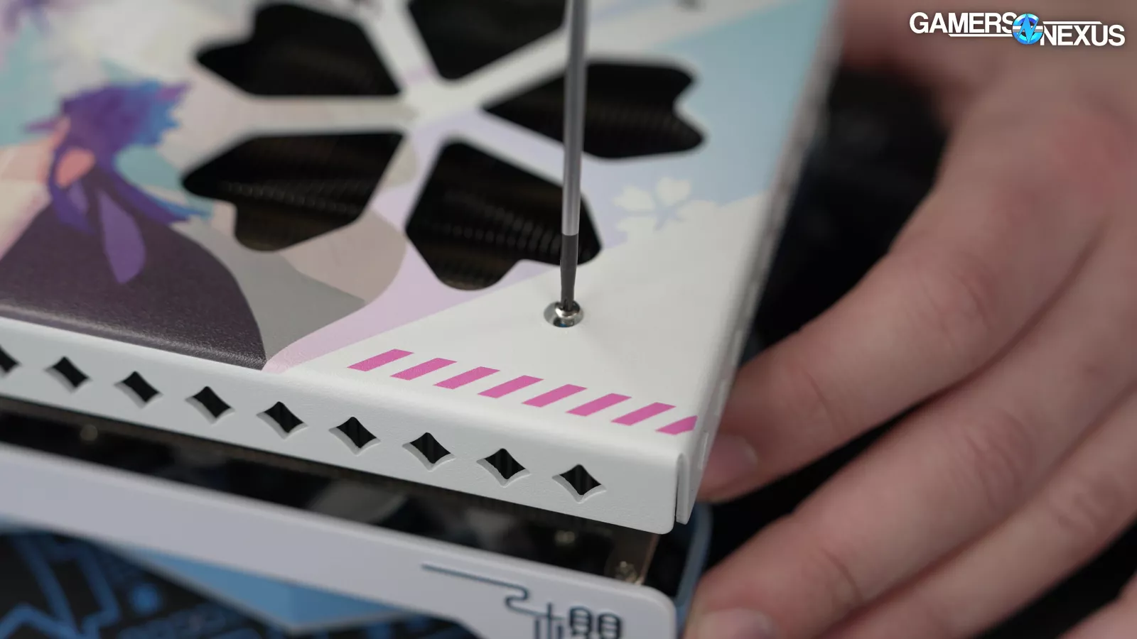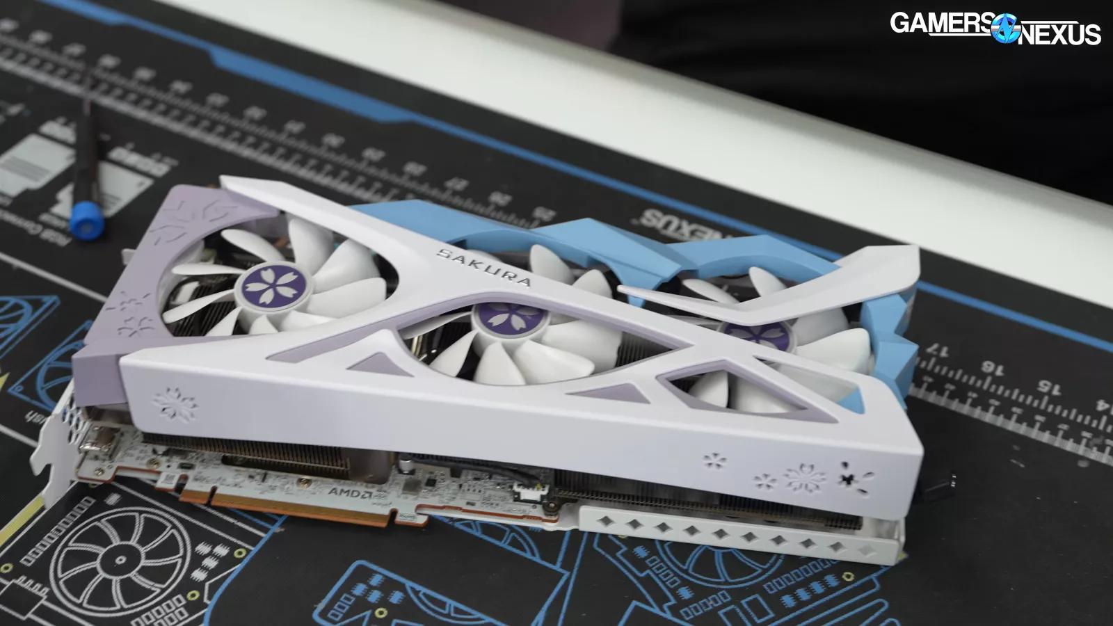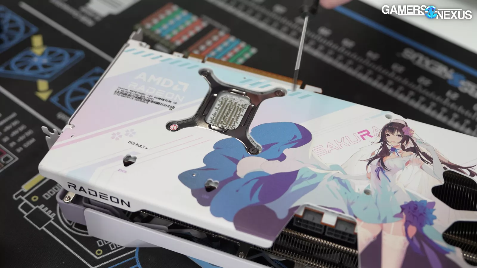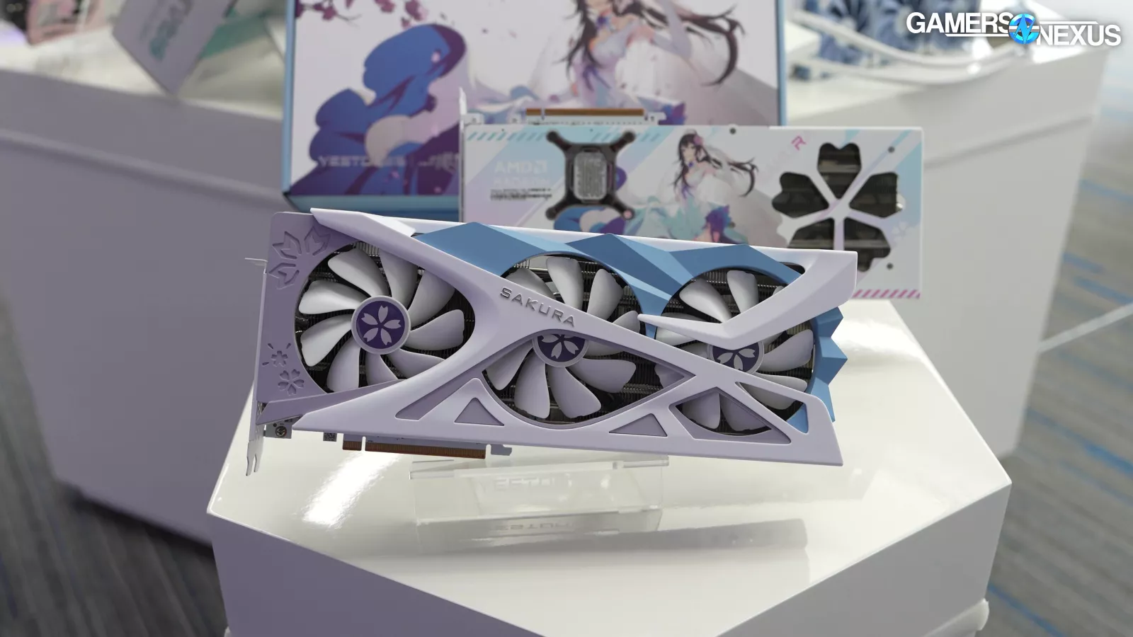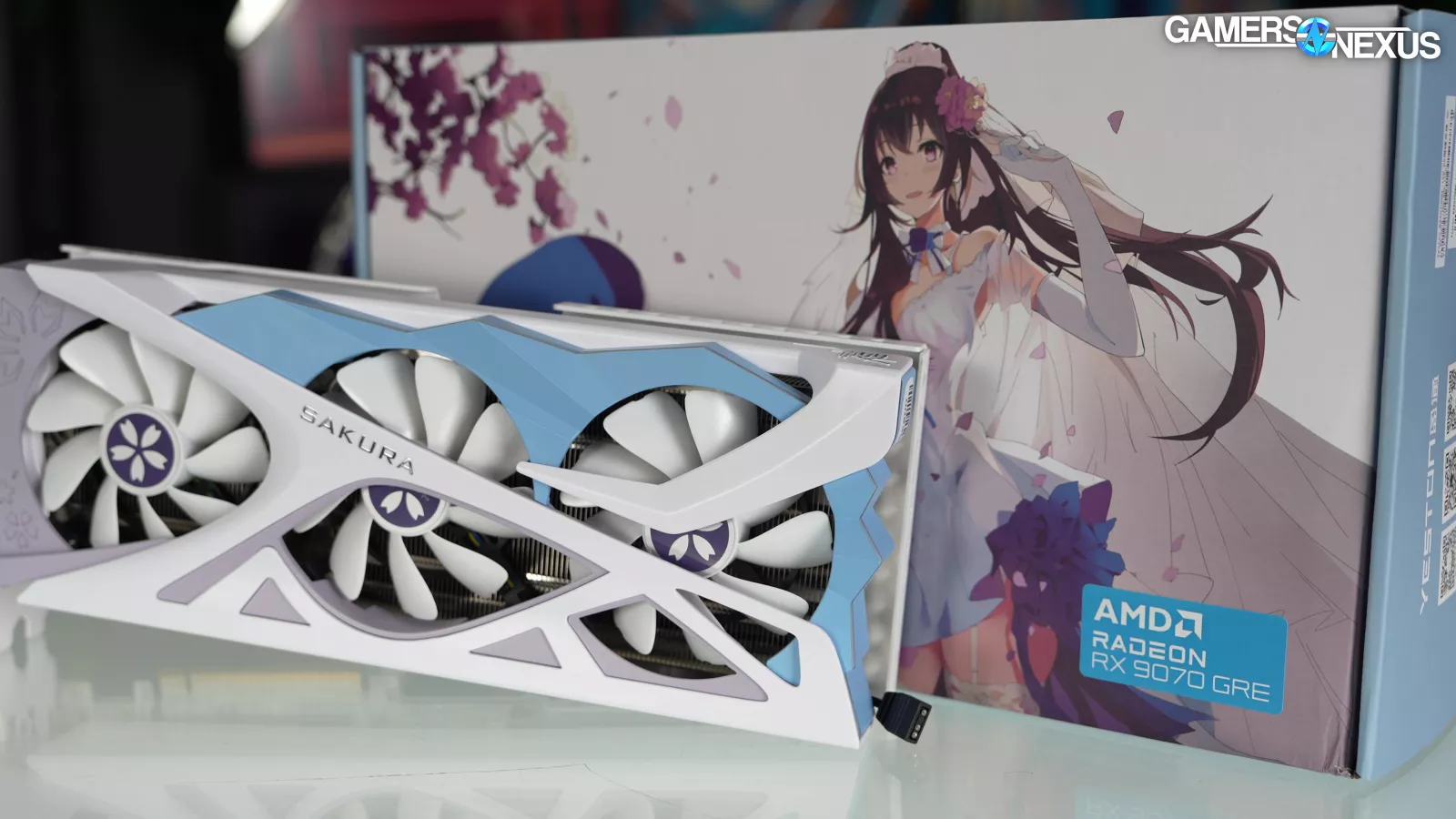 This is the Yeston RX 9070 GRE Sakura Waifu edition. It doesn’t have the scent module that the Sugar Atlantis 9070 XT (read our review) has, sadly, but it does have all the style of the previous Sakura models.