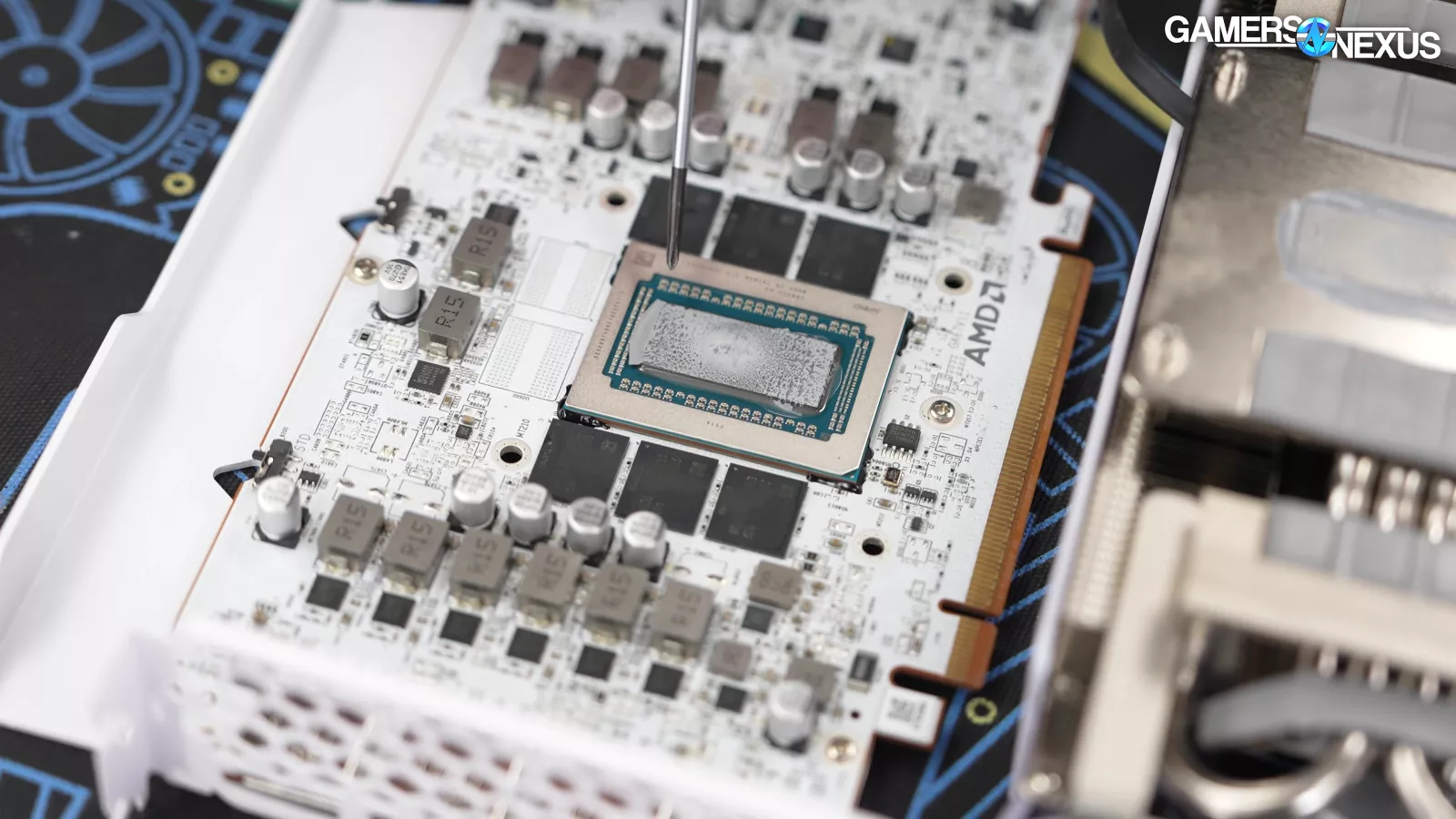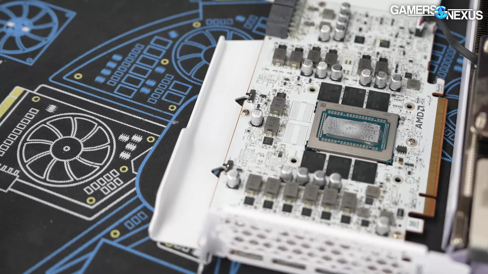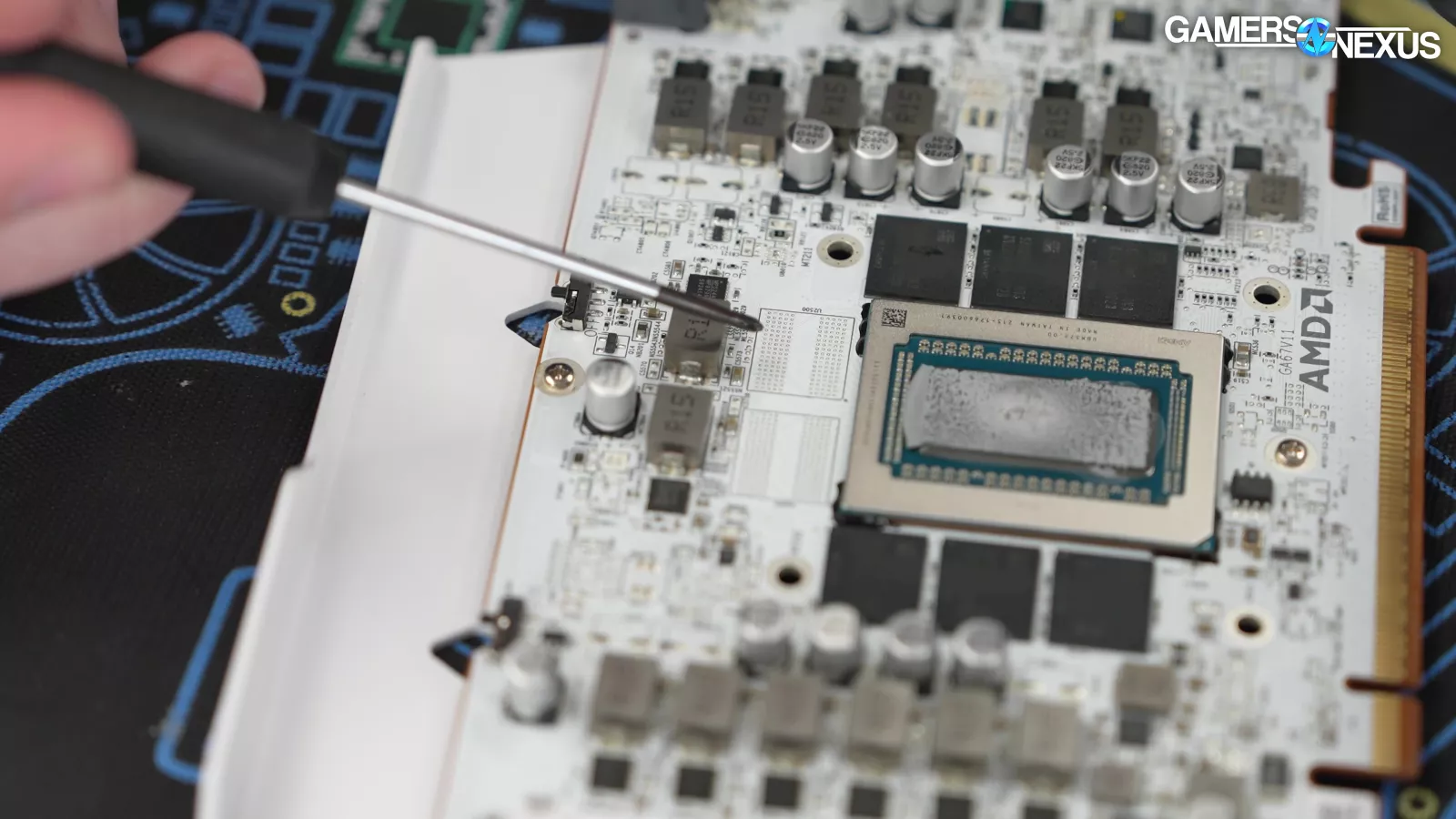 Looking at the card’s PCB, we see 2 blank pads for memory. This card can’t accept more memory, but it’s also configured for XT variants. This allows them to add more for a higher SKU using the same cooler.