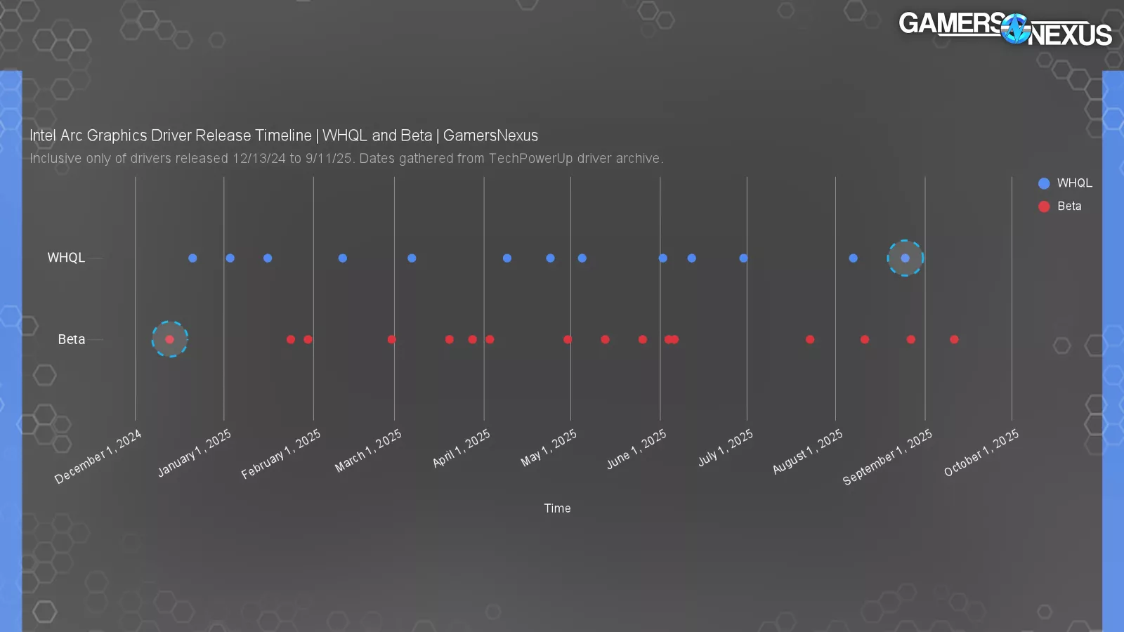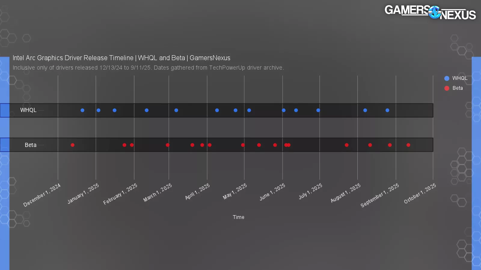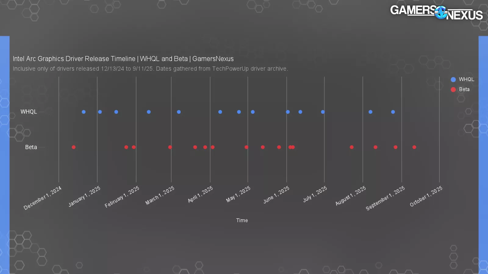 We gathered archival driver release data from TechPowerUp and Intel, starting at the launch of the B-Series (version 6325, December 13, 2024) until roughly mid-September (version 7029), just before Intel made the main driver package Arc-only and kicked out the 14th Gen IGPs and older. It’s possible we missed a few smaller or less documented hotfixes in this.