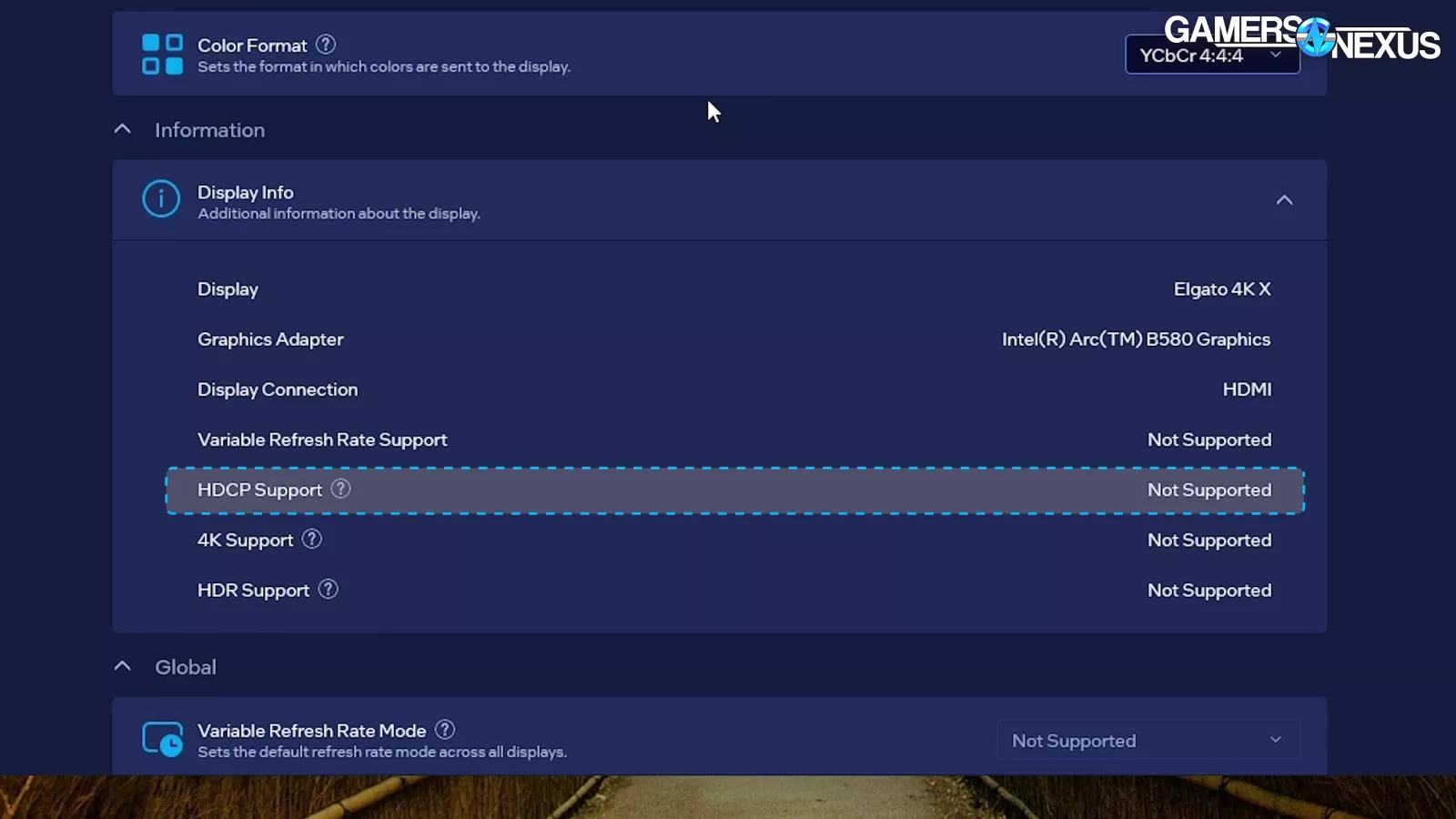 This time, we didn’t have that issue. We didn’t try a bunch of different combinations, but when we hooked up an Elgato 4K X capture card, HDCP support showed as “off” in IGS, and we were able to capture without any friction. We’d still like a manual toggle to control HDCP.