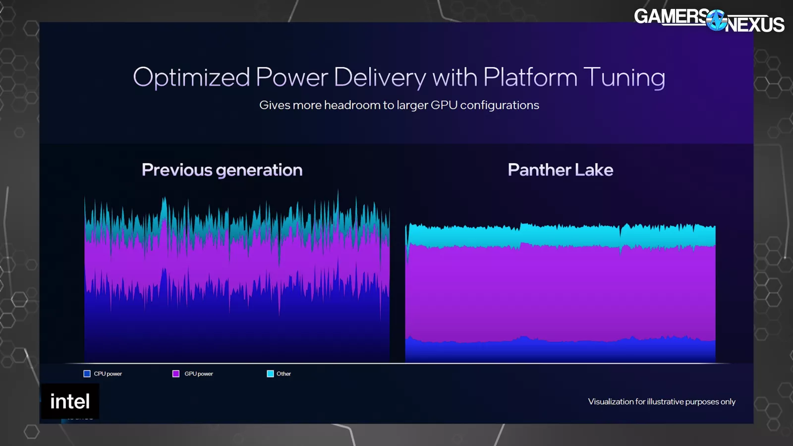 This comparison between Panther Lake and the prior generation of this bias control solution shows that peaks in power utilization have smoothed-out while the GPU power consumption has leveled to be more predictable. Reminder: This is a first-party tests. The GPU is also getting more total power budget as a percentage than previously, while reducing CPU power in exchange. For GPU-bound scenarios in particular, this should be a better outcome. It might help in some CPU-bound scenarios as well.