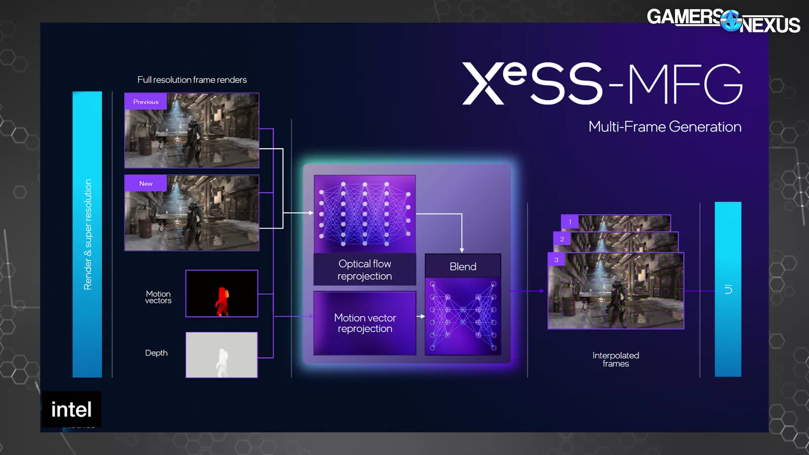 XeSS-MFG is conceptually similar to NVIDIA’s MFG. XeSS-MFG takes 2 real frames to calculate optical flow networks using motion vectors and the depth buffer, then uses that information to generate up to 3 frames between the 2 real frames. The frames are then displayed in order and paced in a way to minimize animation error. We also have a separate deep-dive on our new animation error testing methodology.