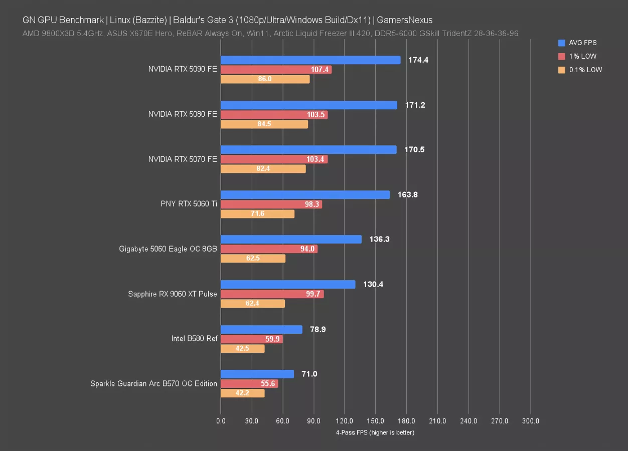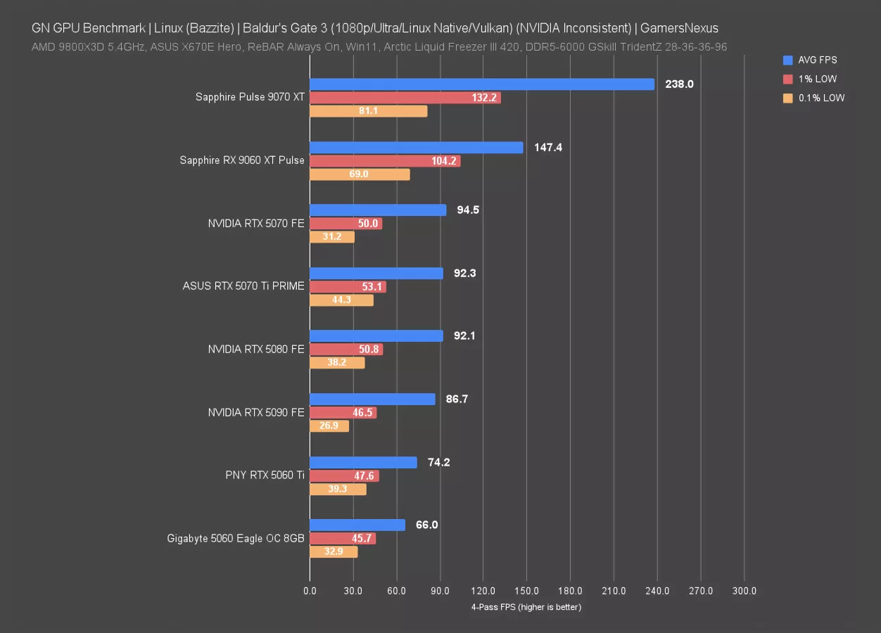 At 1080p and with the Linux native build running the Vulkan API, NVIDIA runs completely sporadically and unreliably. We’re well aware that the 5090 is below the 5070, and that obviously this is not how these cards actually behave. After re-tests and evaluations though, the only thing consistent is inconsistency when it comes to NVIDIA with the Linux native build of Baldur’s Gate 3 with Vulkan.