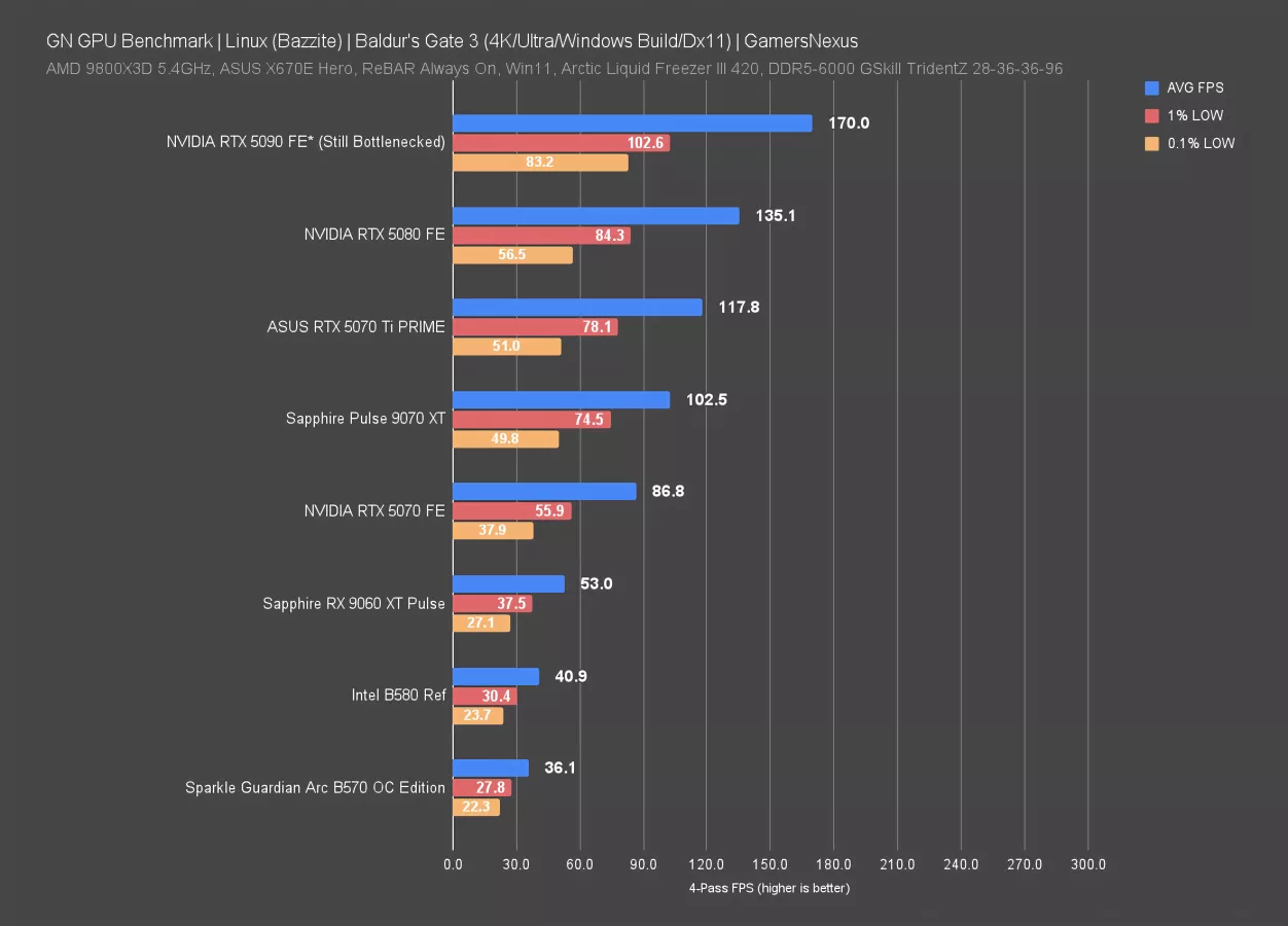 The 5090 held a 135 FPS AVG, leading the 5080 by 46%. The 5070 Ti follows, with the 9070 XT showing up at 72 FPS AVG and landing between the 5070 and 5070 Ti. Intel’s B580 actually did well here with its 58 FPS AVG, planting it just ahead of the 5060 Ti. That’s a compelling argument for Intel.