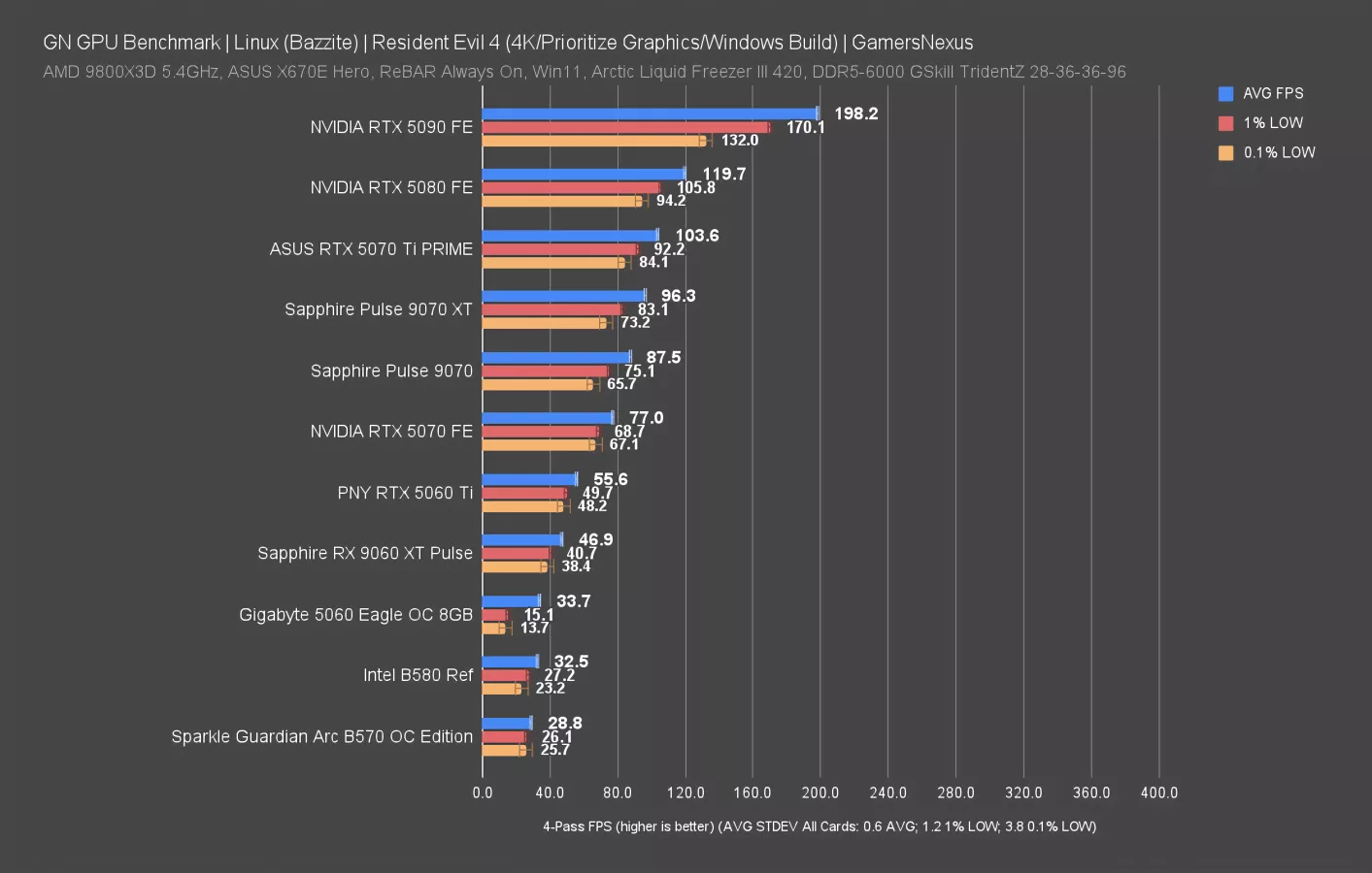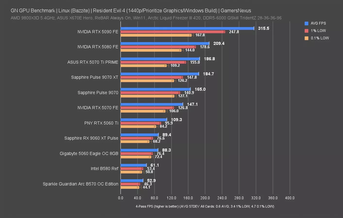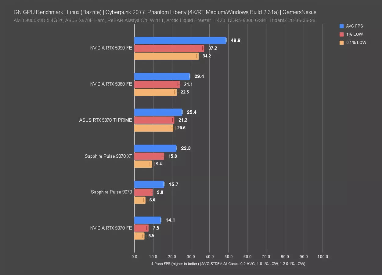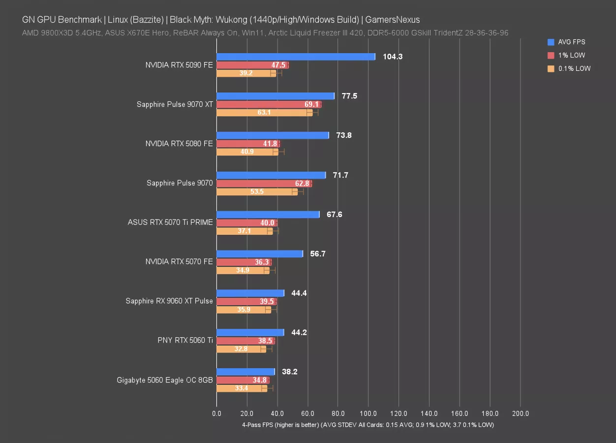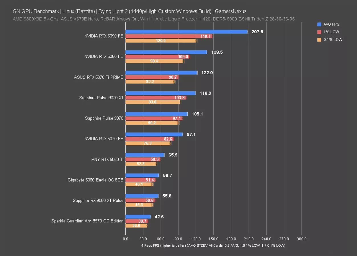 The 5090 (read our review) leads the chart for 1080p at 176 FPS AVG. Just like with Windows, we’ll need to look to higher resolutions to ensure it’s not CPU-bound. The 9070 XT is disturbingly close for NVIDIA, up at 140 FPS AVG and leading the RTX 5080’s 134 FPS result by 3.9%. Lows are about the same between them. The 5070 Ti suffers somewhat in 0.1% lows. On inspection, it had one pass with a 23 FPS 0.1% low, one with 61, and two at 96-97 FPS. The GPU experienced more variance than typical.