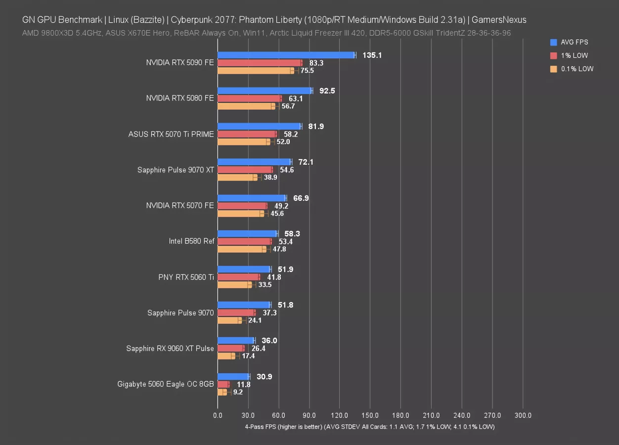 It's been a lot of work, but we have some initial GPU results for Linux, specifically for the Bazzite distribution. The testing was about 3 weeks of nonstop work, plus about 2-3 weeks of bench setup and “bench hygiene” management. We’re still learning. Benchmarking anything to the level of isolation we maintain requires a lot of controls and experience, so you’ll have to work with us while we learn these processes.
