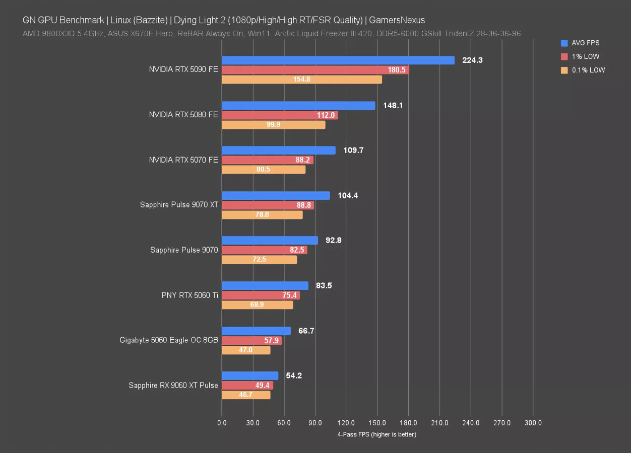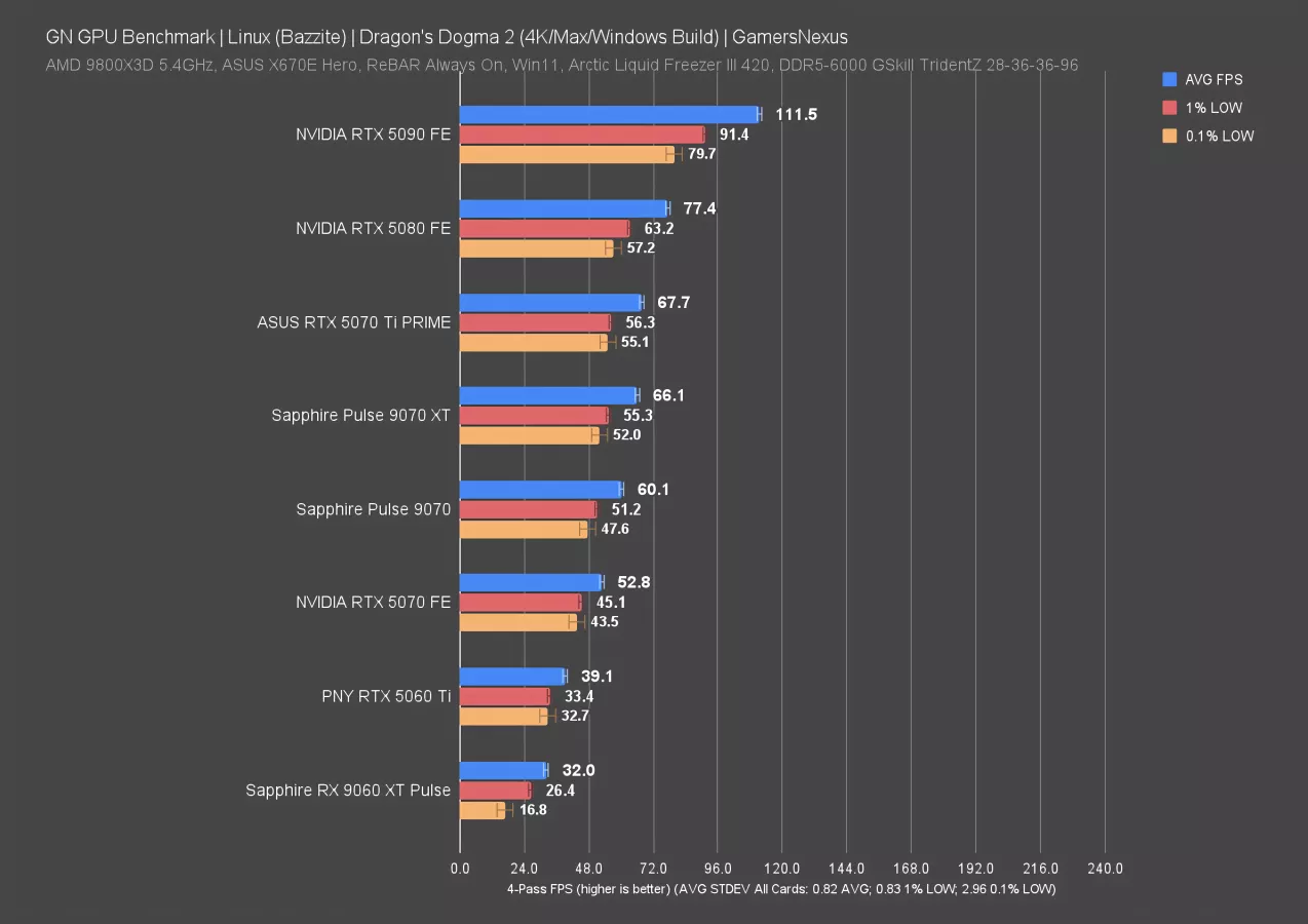 We’ll start with the Windows build of Dragon’s Dogma 2 at 1080p/Max settings. For this testing, we used KDE Plasma 6.4.4, KDE Framework 6.17.0, Qt 6.9.2, Wayland, and 10.0-2e Proton, except the 9070 XT (read our review) and 5070 Ti (read our review), which ran earlier and were both experimental 10.0-20250919.