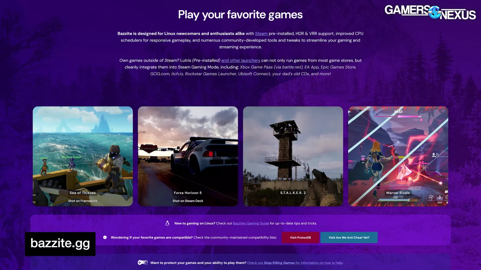 For gaming, the NVIDIA Bazzite build worked as well for us as the non-NVIDIA build, at least with the relatively new GPUs that we tested.