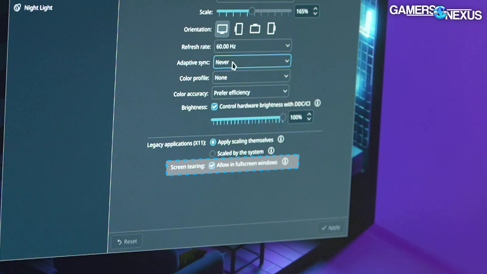 To cover the equivalent settings that we'd change on Windows, we set "Adaptive Sync" to Never, allowed screen tearing for fullscreen windows, and set the power profile to Performance. We've had warnings from Wendell and others about kernel spinlock performance loss, the CPU performance governor, and plenty of other Linux-y things, but the advantage of a plug-and-play OS like Bazzite is that we can just install it and run it. Any issues are a valid part of the experience.