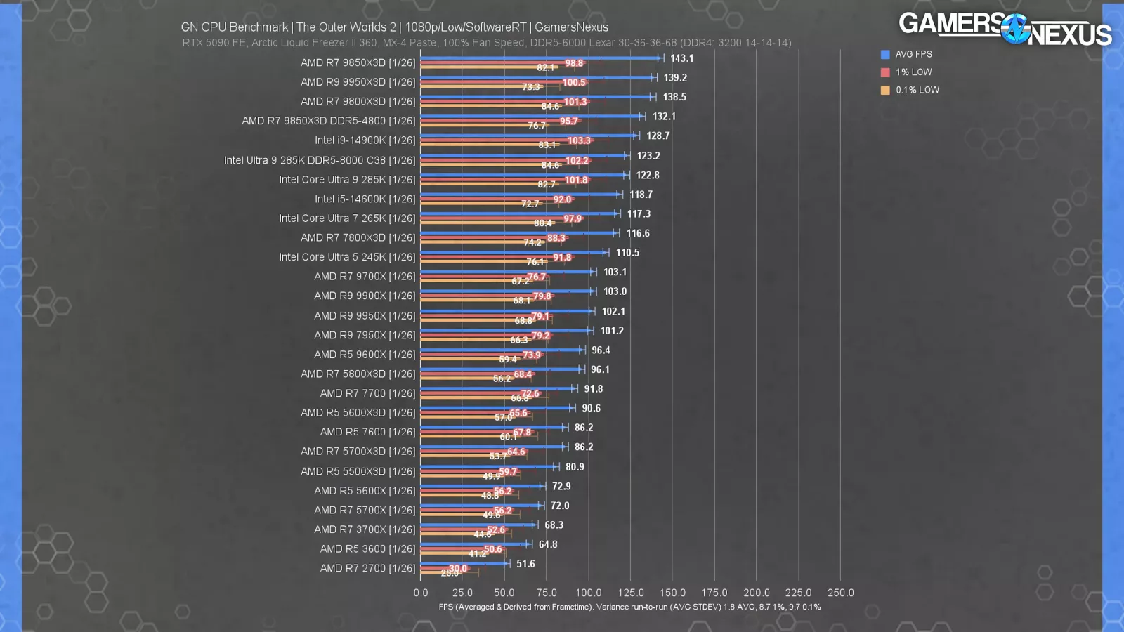 In The Outer Worlds 2 at 1080p, the 9600X and 265K swap, giving the 265K a 21.7% lead for 67.6% more money. Not worth it.