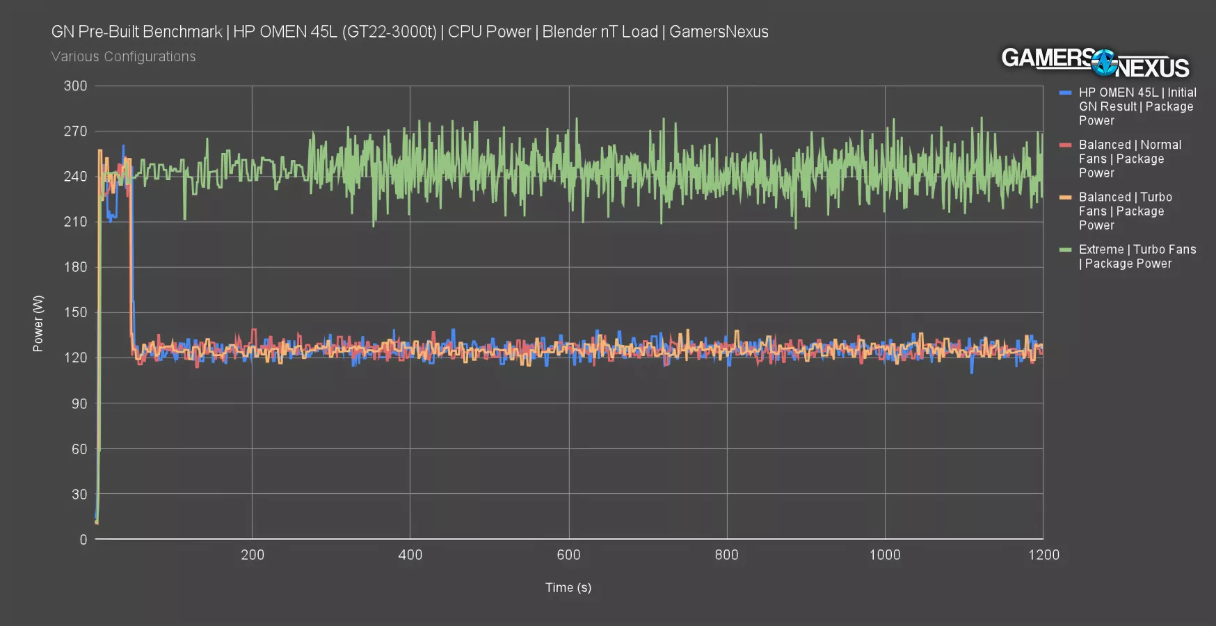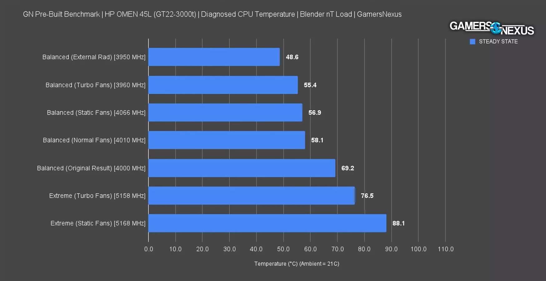 Using HP’s various preset profiles and some of our own custom tests, we found that the CPU frequency gets closer to stock DIY expectations -- but still not quite there -- by enabling “Extreme” mode for the power budget and “Turbo” fans. That sets the higher power limit and we’ve now admitted to voiding our warranty, apparently, but that got us to 5158MHz up from the 4000MHz range. The various other tests included a 4010 MHz entry with Balanced and normal fans and a similarly poor result with Turbo fans and balanced. The result isn’t that different with the constrained power limit.