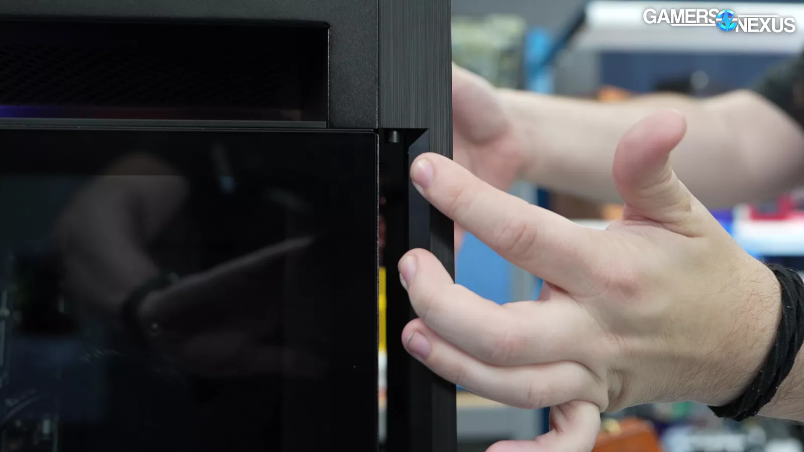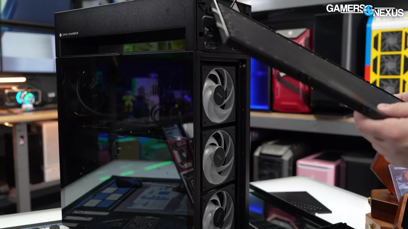 Continuing our tear-down, we removed the case’s front dust filter, which is behind a sheet of glass. This is, again, bad for airflow.