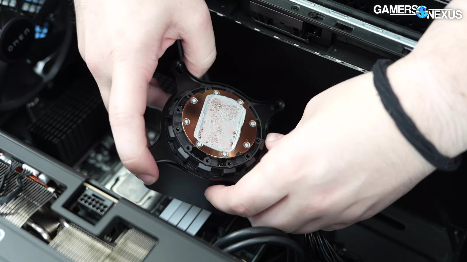 Their so-called “cryo chamber” is seriously hurting performance, anyway: By removing the radiator from its mummifying wrap and enclosed tomb of impedance, we reduced the temperature like-for-like by about 10 degrees Celsius. That is a huge improvement for something that’s supposed to be “Cryo.” If HP had mounted the radiator to the front of the case and put it behind a mesh panel, it’d probably split the difference here; instead, its patented gimmick is running the system hotter, which is contributing to their likely concern of noise levels if they were to run it properly. A better radiator location and chamber would reduce temperature, which would allow them to achieve the same thermals for similar noise, which would allow them to boost the CPU frequency.