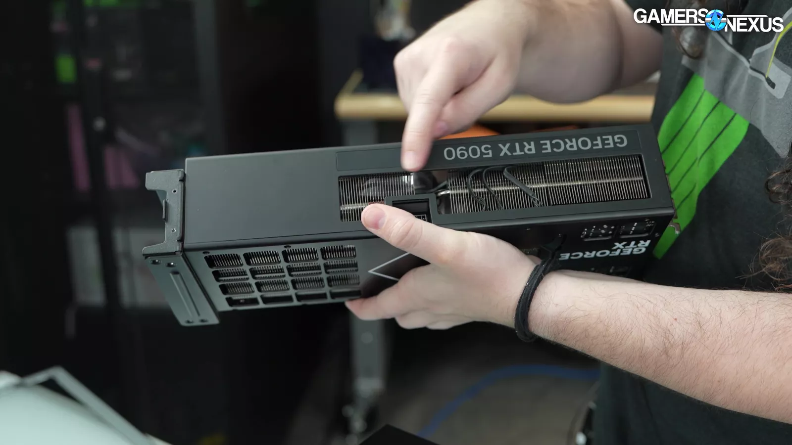 The equal-but-opposite reaction to the CPU’s throttling is that the GPU doesn’t have enough work because the CPU can’t provide it, which reflects in the GPU temperature. The 5090 (read our review) briefly cools when it doesn’t have enough work to do, despite being at about 80 degrees for core initially. Temperature drops from about 80 degrees to the mid 70s near the end while GPU fan speed drops, due in part to the case fans speeding up and in part to the low load provided to the GPU by the CPU.