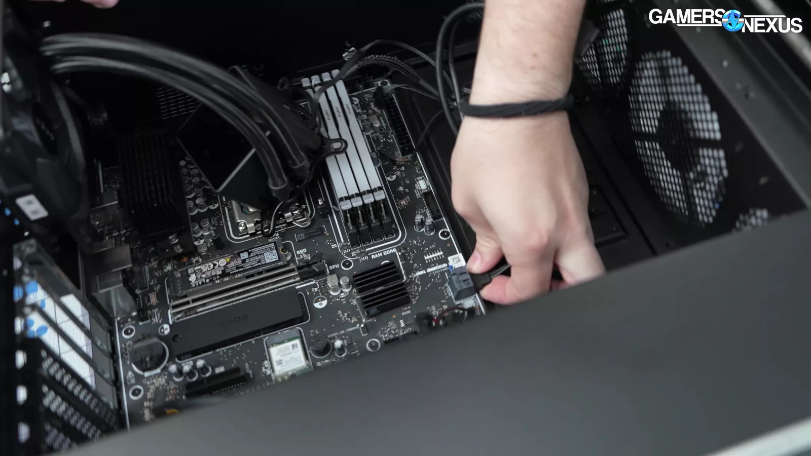 The RAM choice is sub-optimal and made far worse by the fact that XMP wasn’t on, which is just really sad at this point. 64GB is what we want at this price, but not slow DDR5-5600, although that’d still be better than the DDR5-4800 it’s running at out of the box. That’s an insane combination that even a novice DIY PC builder wouldn’t make. Intel Arrow Lake has a strong memory controller – so we’d like to see 6000 minimum, or 6400 preferred, as 6400 is officially supported. It can even be cheaper RAM.