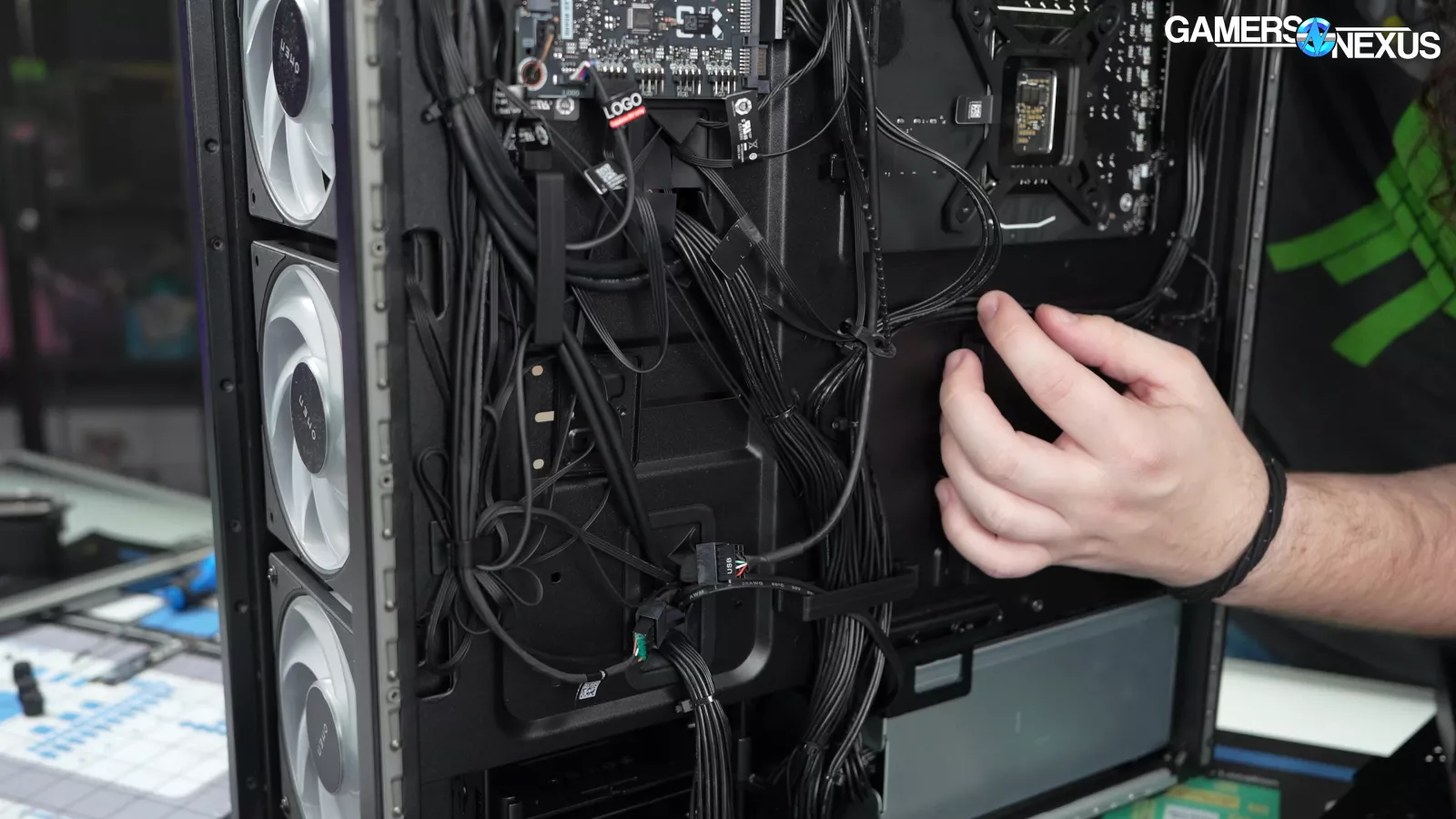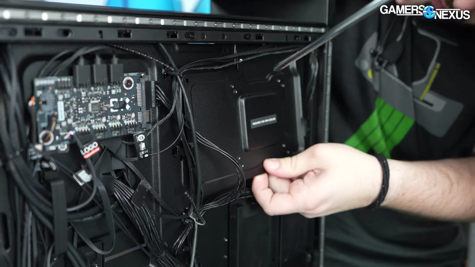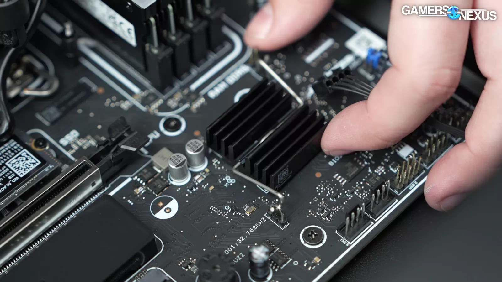 Removing the back side panel, we noticed a plate that said “required for VRM cooling,” which we proceeded to take off. This exposed some thermal pads for the VRM mosfets, which is a nice touch, but it’s hard to appreciate when the CPU runs up to 105 degrees Celsius.