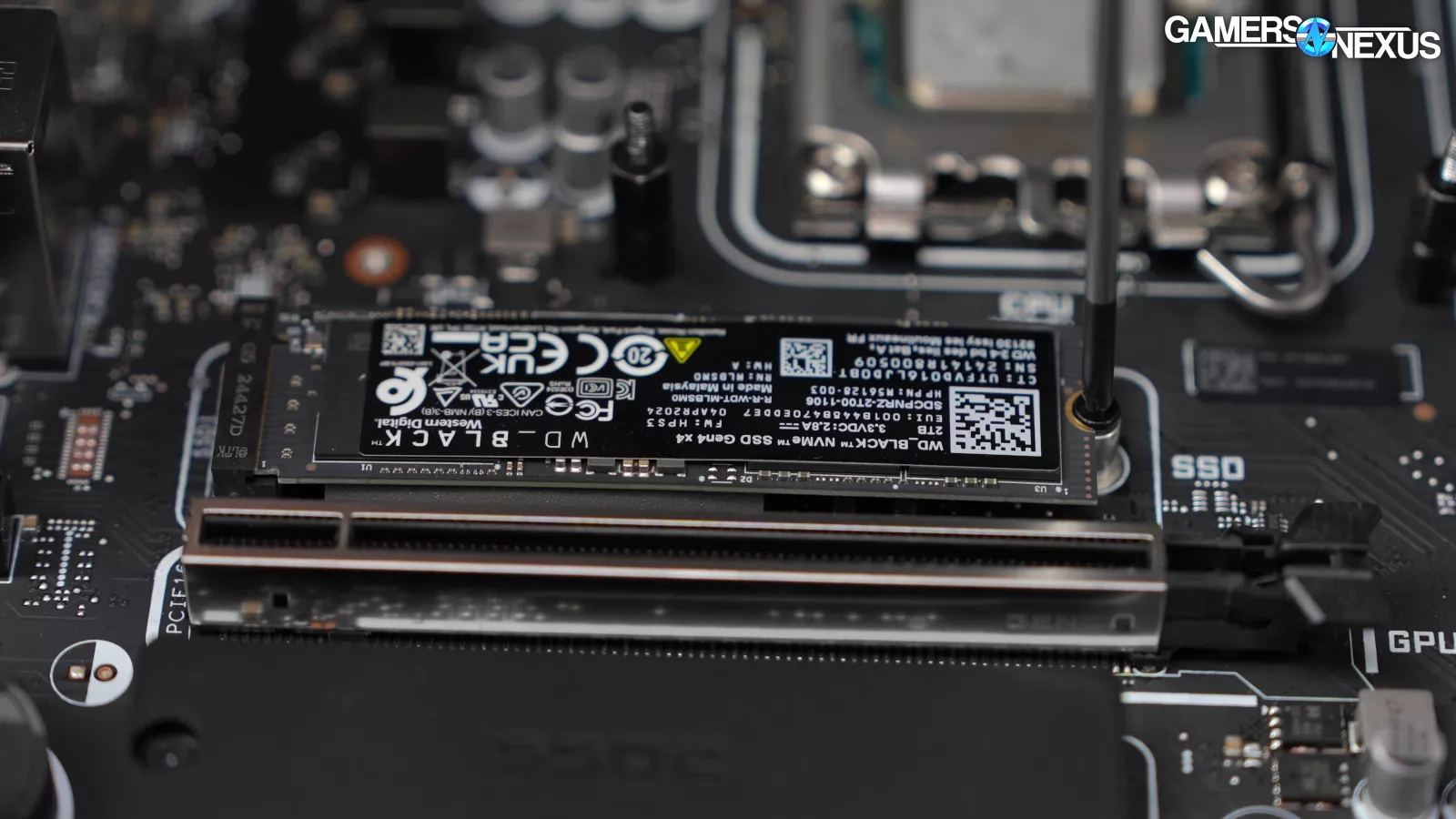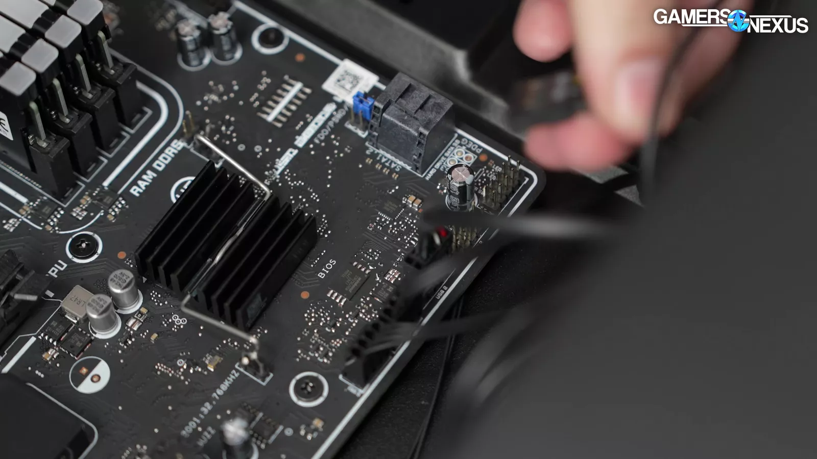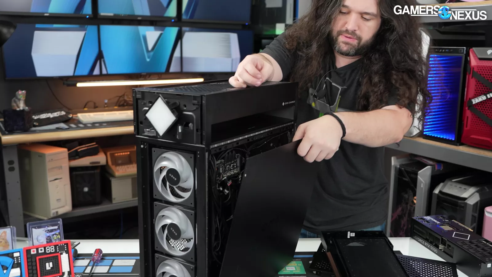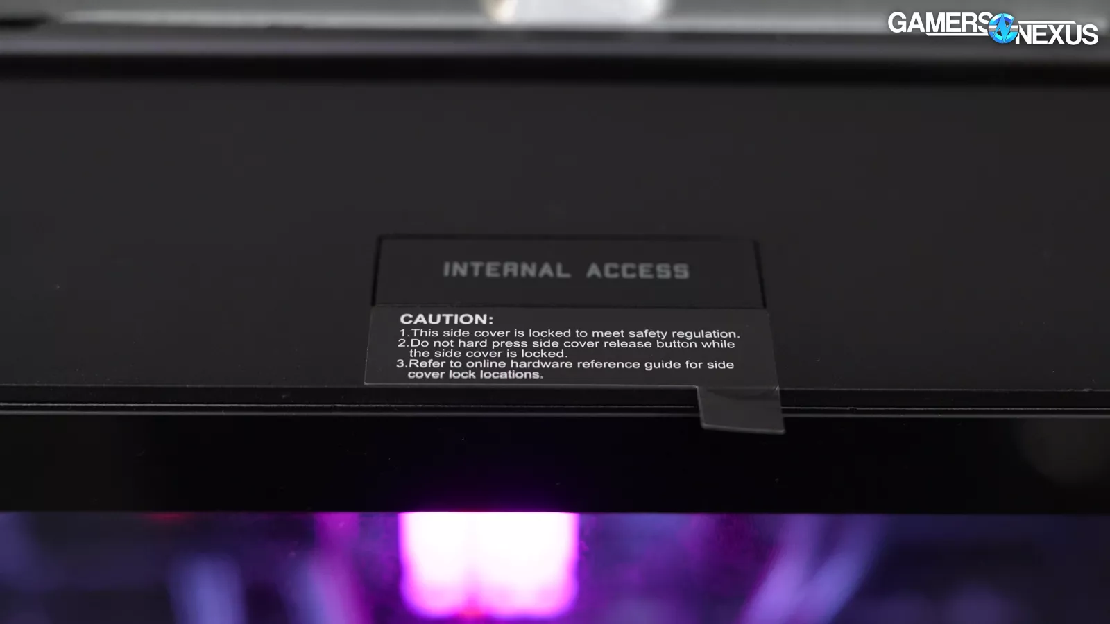 Removing the back side panel, we noticed a plate that said “required for VRM cooling,” which we proceeded to take off. This exposed some thermal pads for the VRM mosfets, which is a nice touch, but it’s hard to appreciate when the CPU runs up to 105 degrees Celsius.